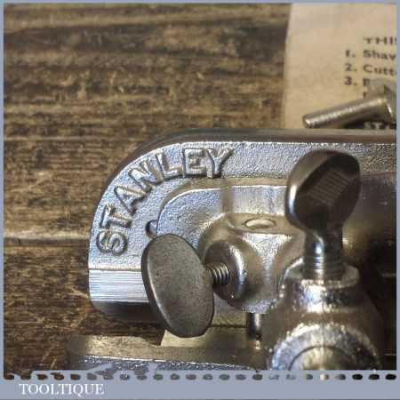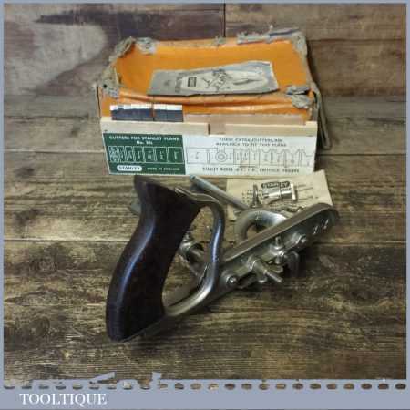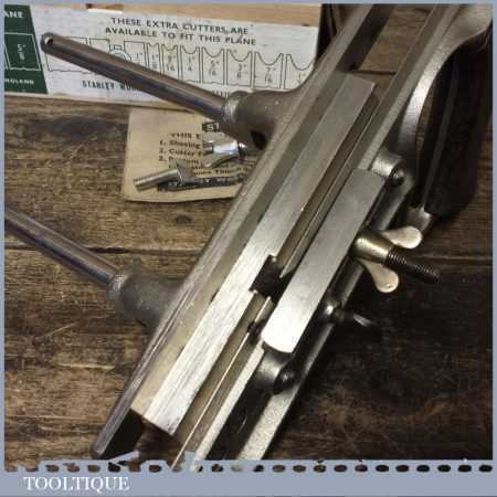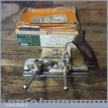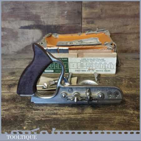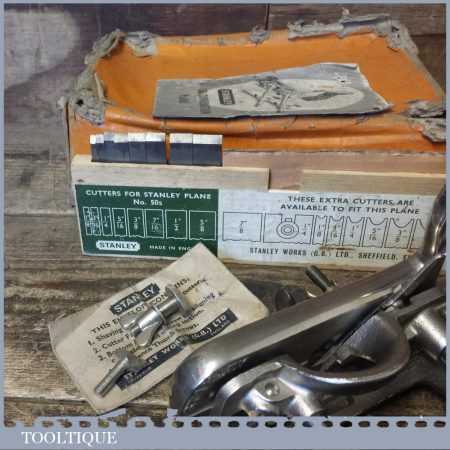Vintage boxed Stanley No: 50s combination plough plane complete with 8 cutters, fully refurbished and ready for use. The plane is in good condition and all components move smoothly. Note: We do not sharpen the irons and the box is well worn but has done its job of protecting the plane.