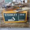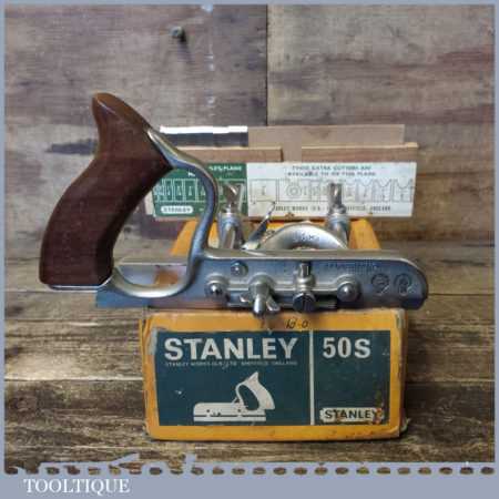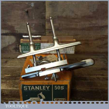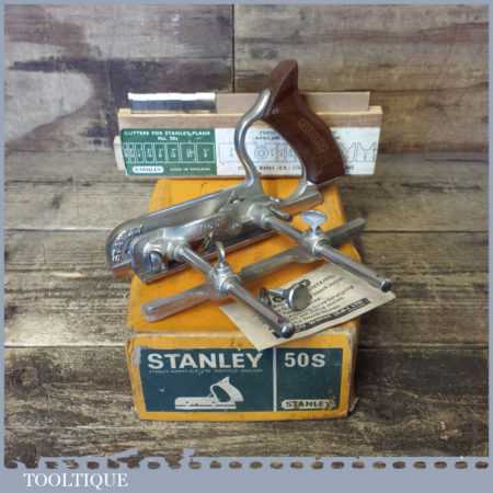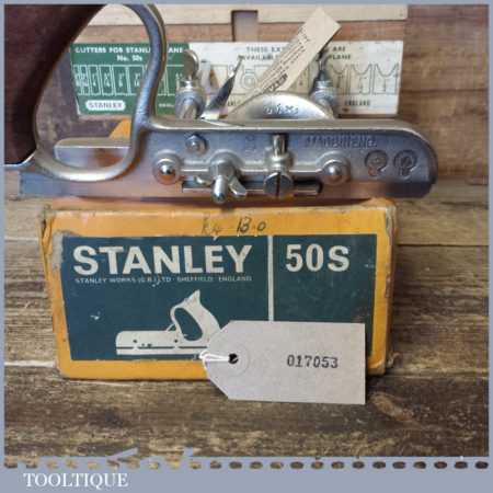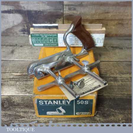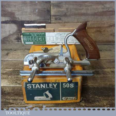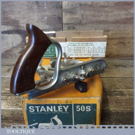 Vintage boxed Stanley England No: 50s combination plough plane complete with 8 cutters, fully refurbished and ready for use. The plane is in good condition and all components move smoothly. Note: We do not sharpen the irons.