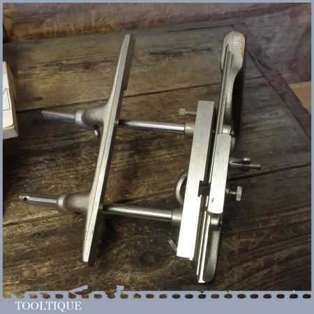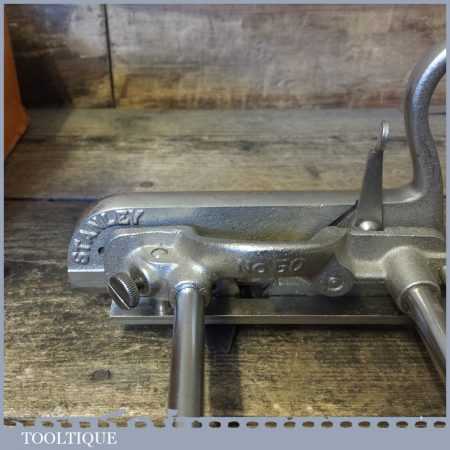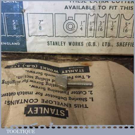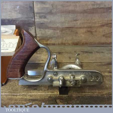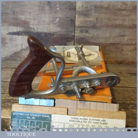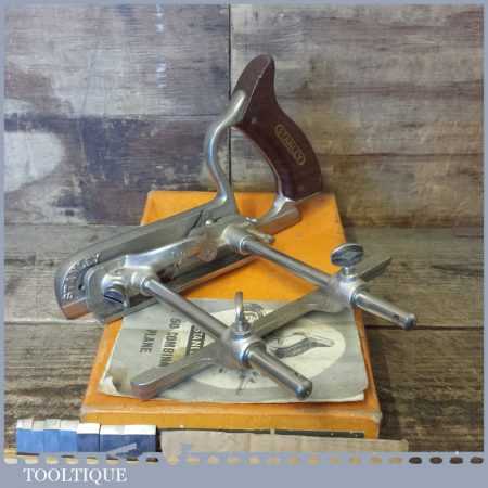 Vintage boxed Stanley No: 50s combination plough plane complete with 8 cutters, fully refurbished and ready for use. The plane is in good condition and all components move smoothly. Note: We do not sharpen the irons.