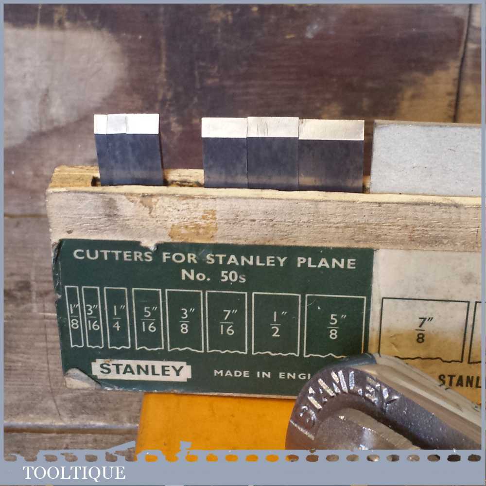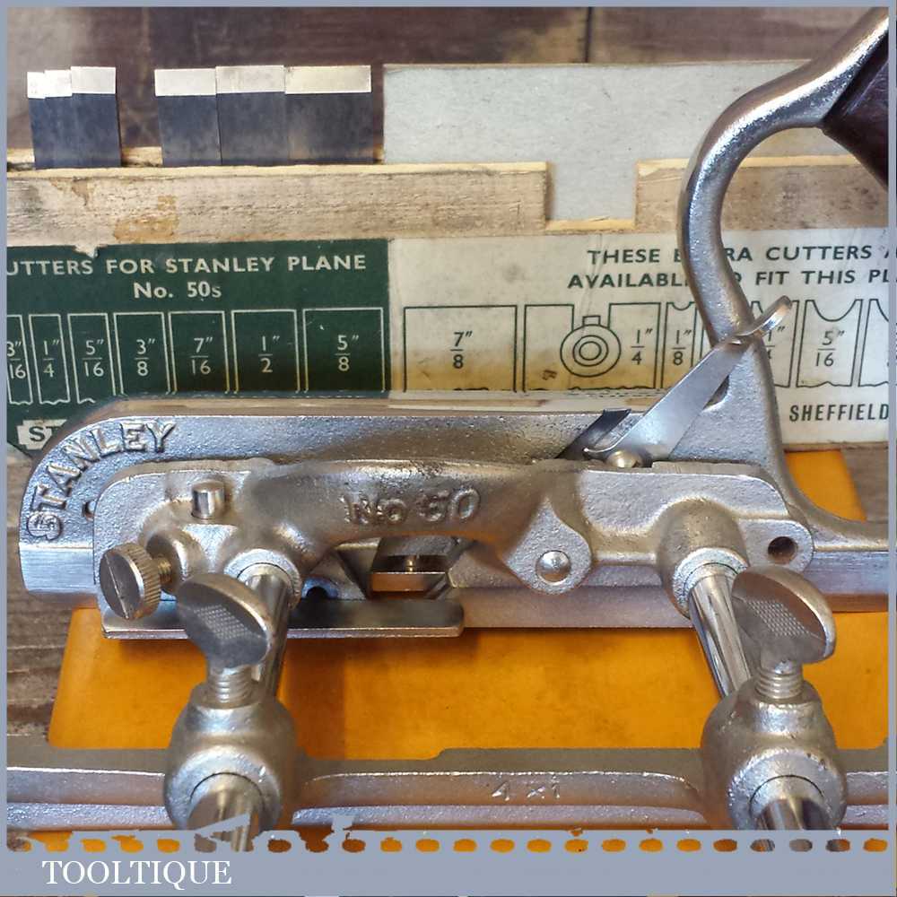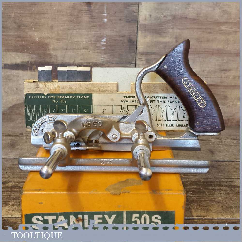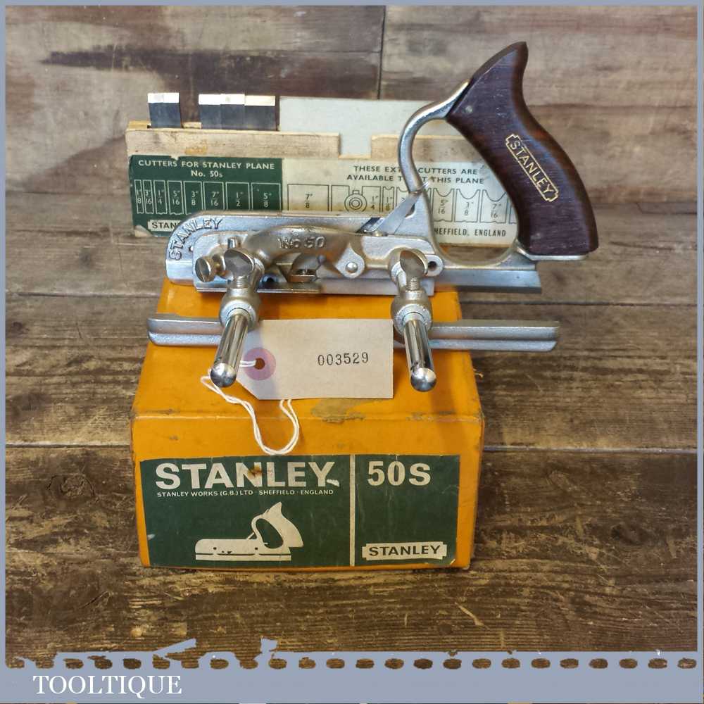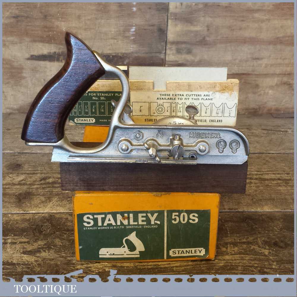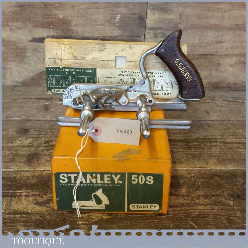 Vintage Boxed Stanley No: 50s combination plough plane in very good used condition. Note: This model only came with basic flat irons of which there are a couple missing.