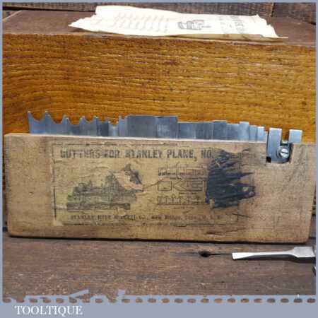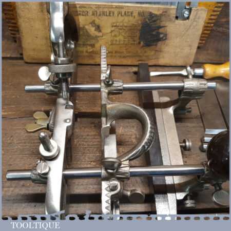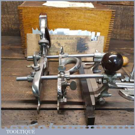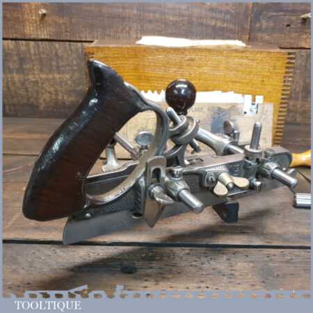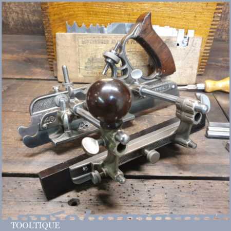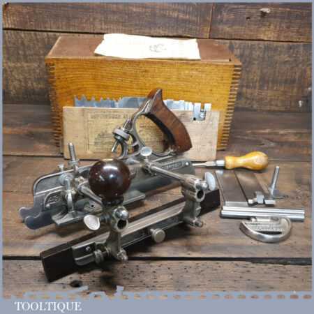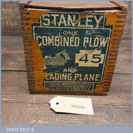 Vintage boxed Stanley Rule & Level Co. USA No: 45 combination plough plane (Pat dated 1884 & 1895) complete with a full set of 21 cutters. The plane is in good condition and all components move smoothly. Note: We do not sharpen the irons.