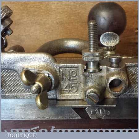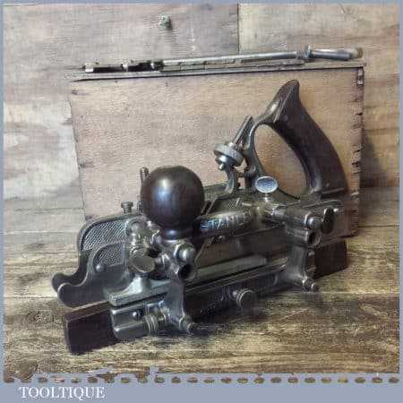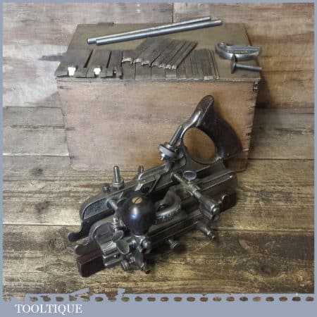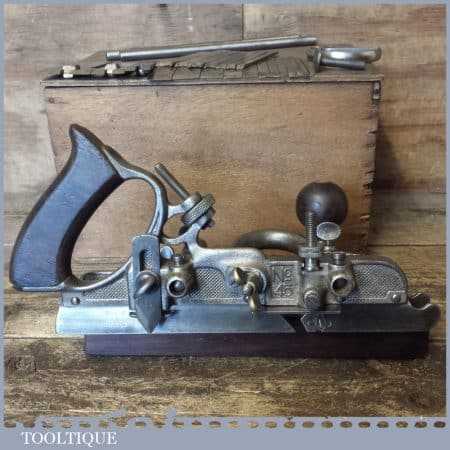 Vintage boxed Stanley Sweetheart USA, No: 45 combination plough plane complete with 22 cutters. The plane is in good condition and all components move smoothly. Note: We do not sharpen the irons.