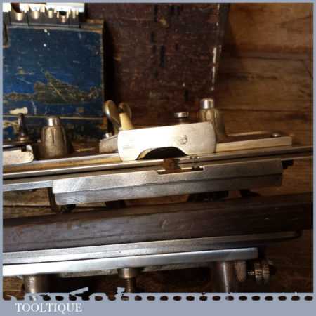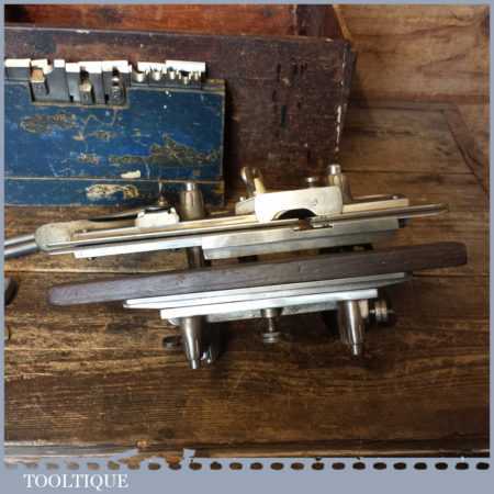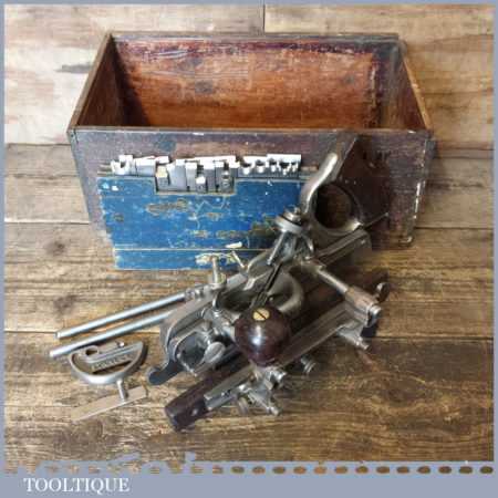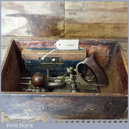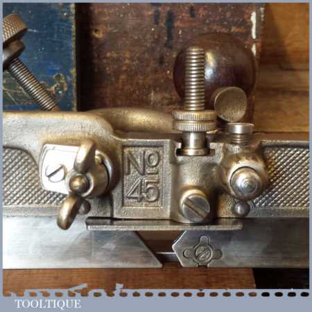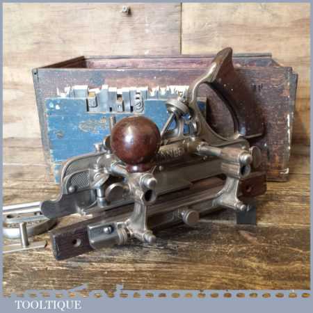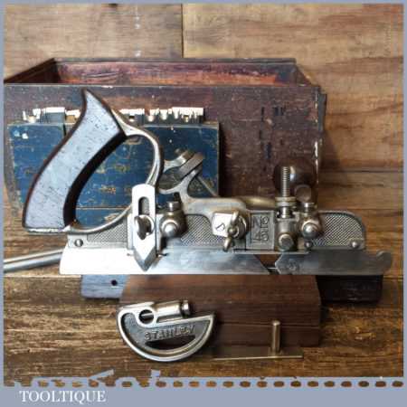 Vintage boxed Stanley Sweetheart USA No: 45 combination plough plane complete with two boxes of cutters. The plane is in good condition and all components move smoothly. Note: We do not sharpen the irons. Note: box has no lid.