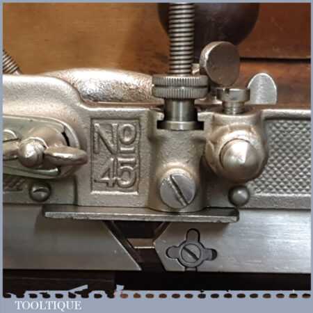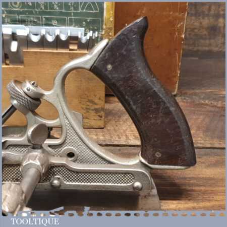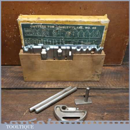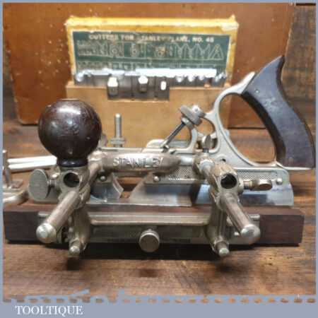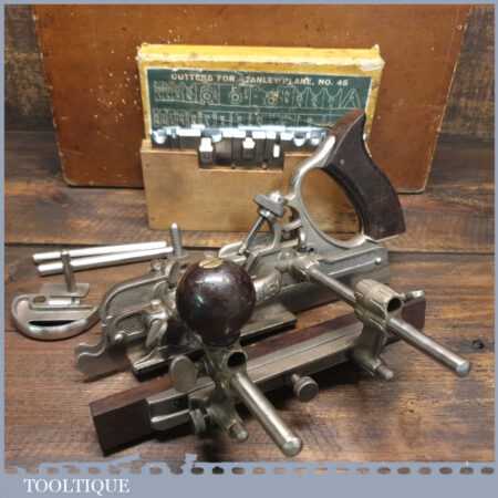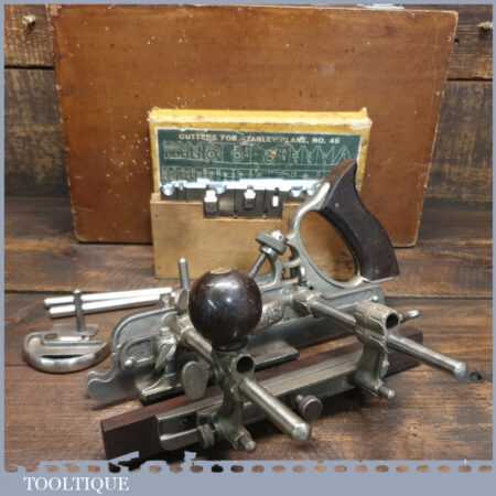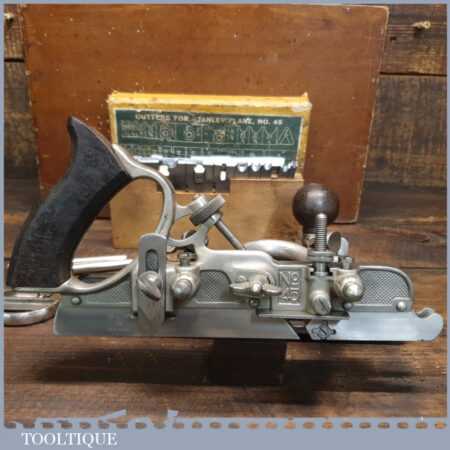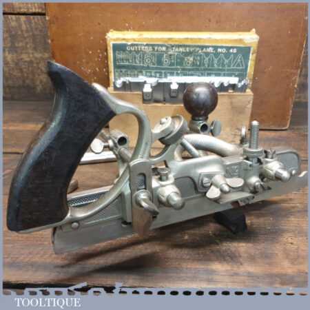 Vintage custom boxed Stanley Sweetheart USA No: 45 combination plough plane complete with cutters, fully refurbished ready for use and in good used condition. Note: We do not sharpen the irons.