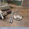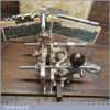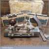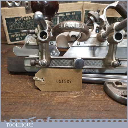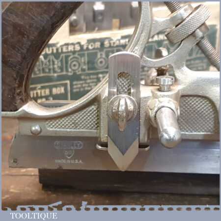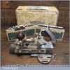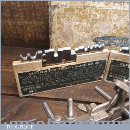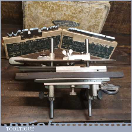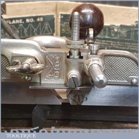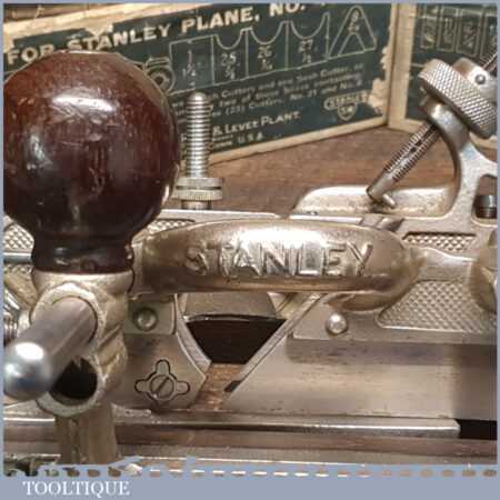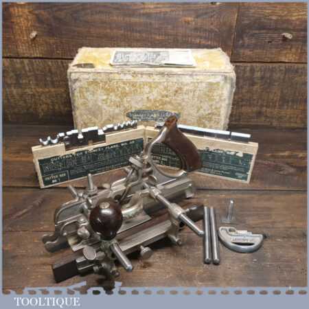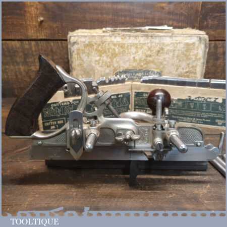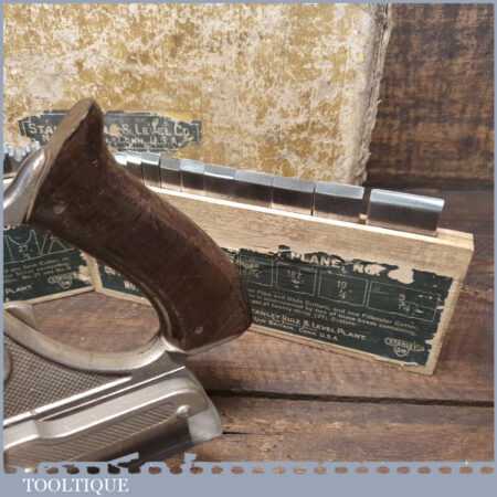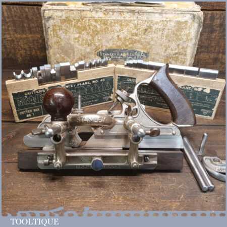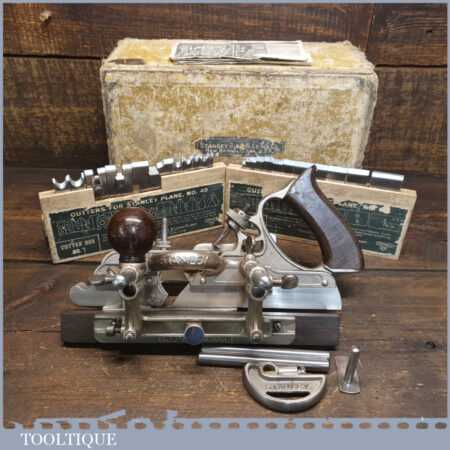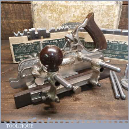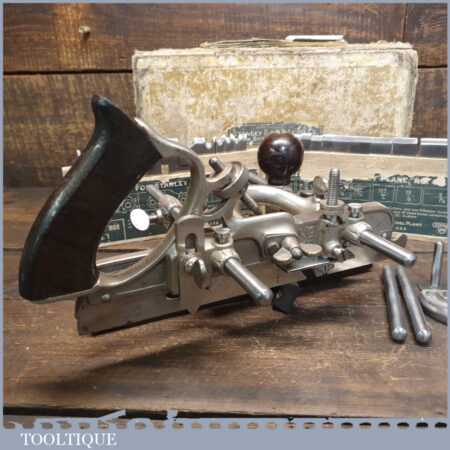 Vintage boxed Stanley Sweetheart USA, No: 45 combination plough plane complete with a full set of cutters. The plane is in good condition and all components move smoothly. Note: Small chip to rosewood fence but this won’t affect its use. We do not sharpen the irons.