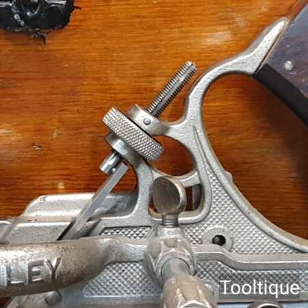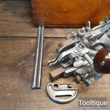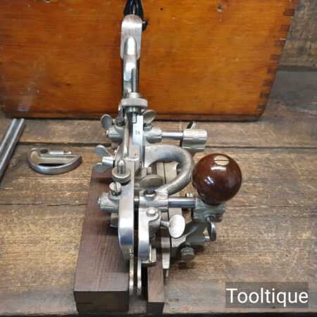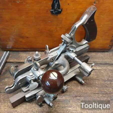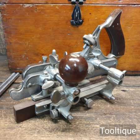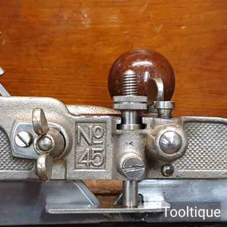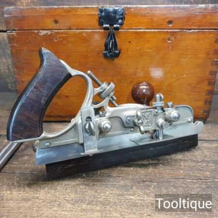 Vintage boxed Stanley Sweetheart USA, No: 45 combination plough plane complete with two boxes of cutters. The plane is in good condition and all components move smoothly. Note: We do not sharpen the irons.