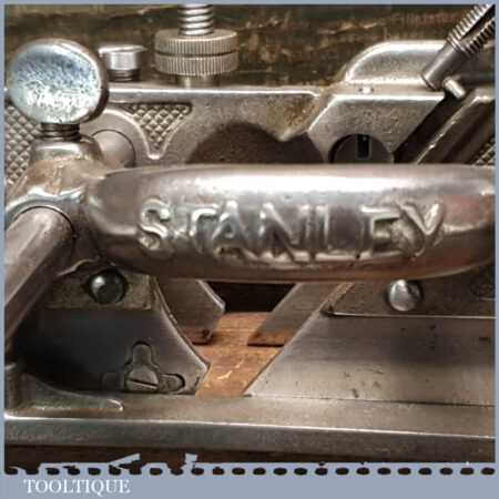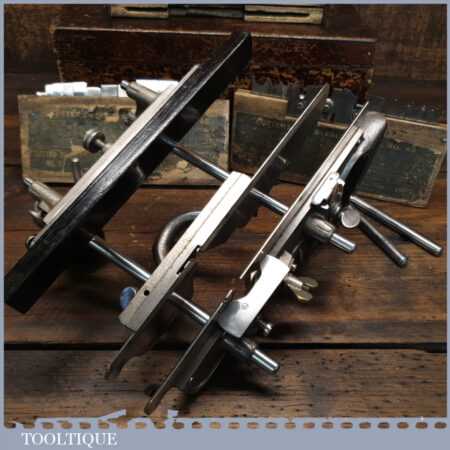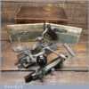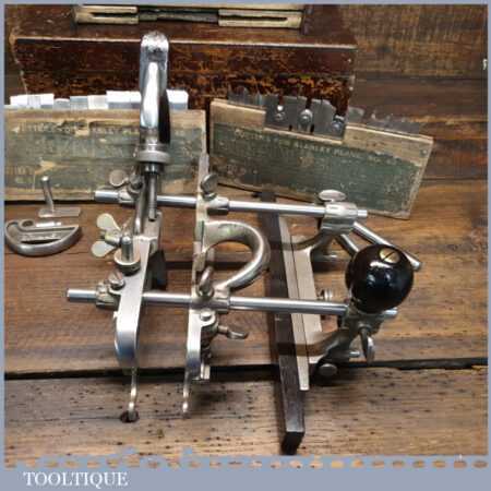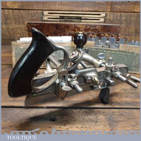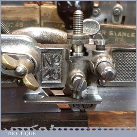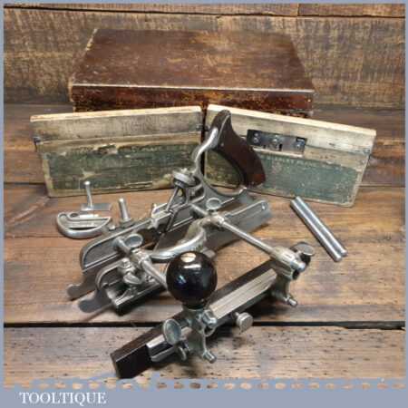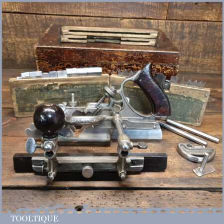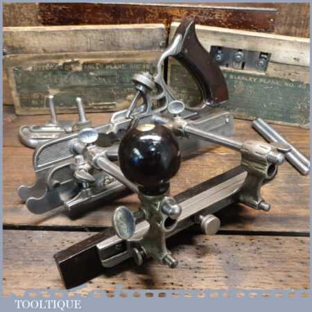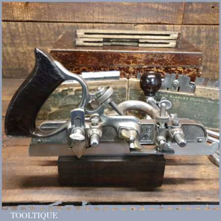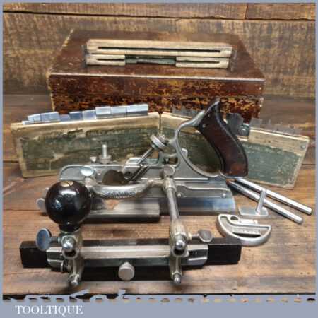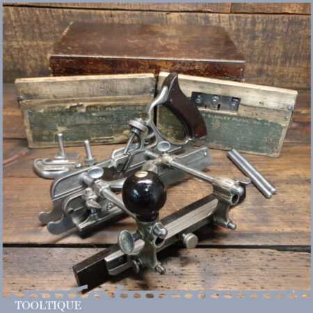 Vintage boxed Stanley Sweetheart USA No: 45 combination plough plane complete with two boxes of cutters. The plane is in good condition and all components move smoothly. Note: We do not sharpen the irons.