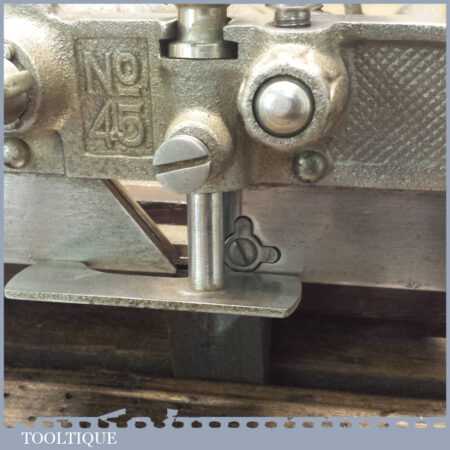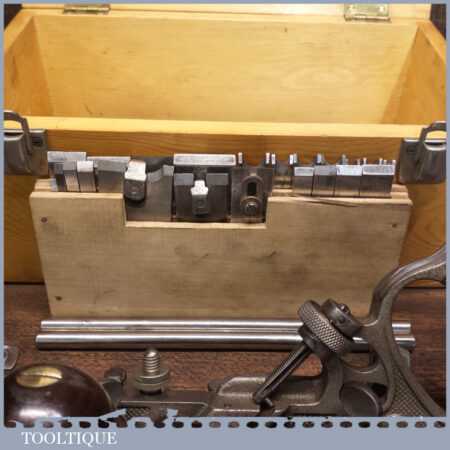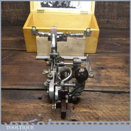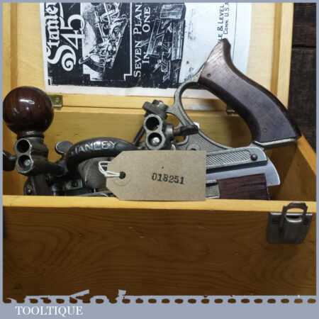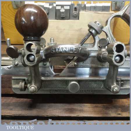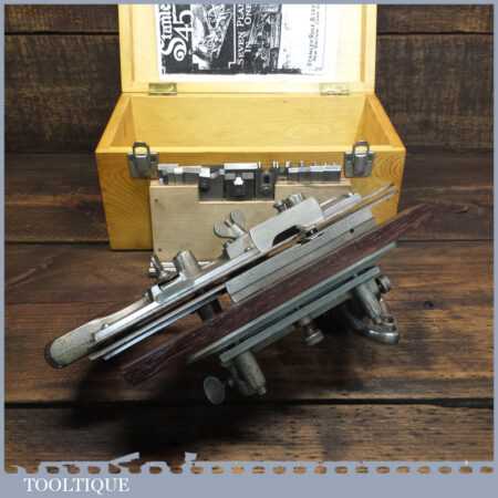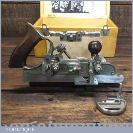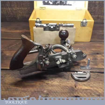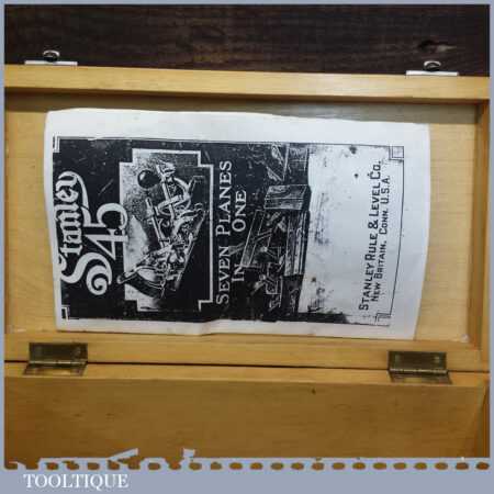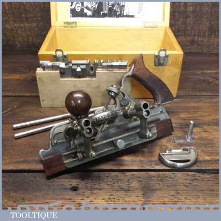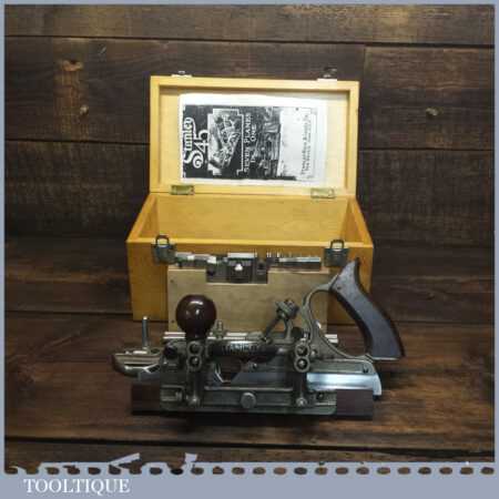 Vintage boxed Stanley USA, No: 45 combination plough plane complete with two boxes of cutters. The plane is in good condition and all components move smoothly. Note: We do not sharpen the irons.