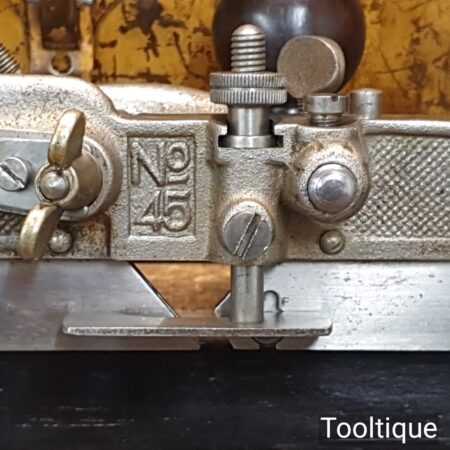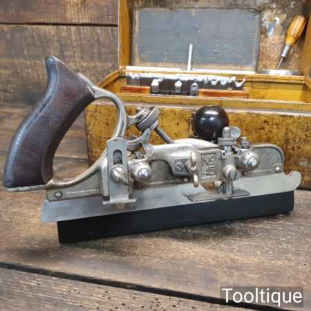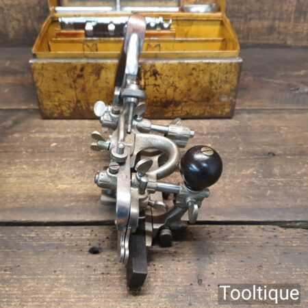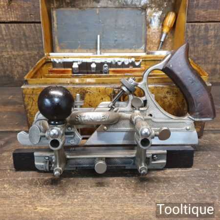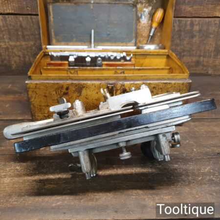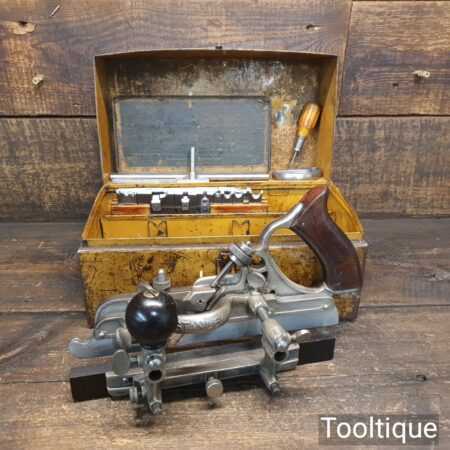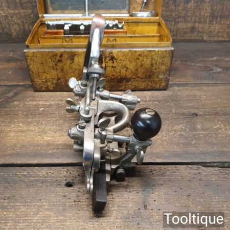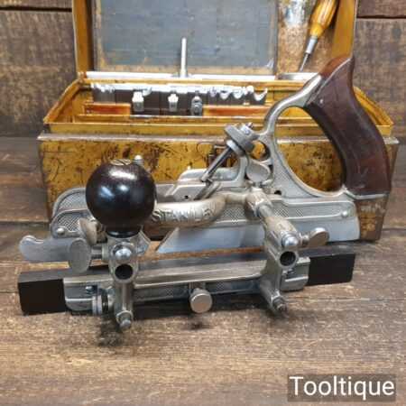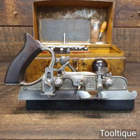 Vintage boxed Stanley USA, No: 45 combination plough plane in original metal box, complete with a full set of cutters. This come in an original Stanley 45 tin steel box which are pretty hard to find. The plane is in good condition and all components move smoothly. Note: We do not sharpen the irons