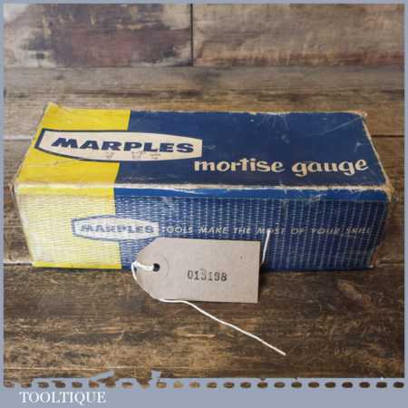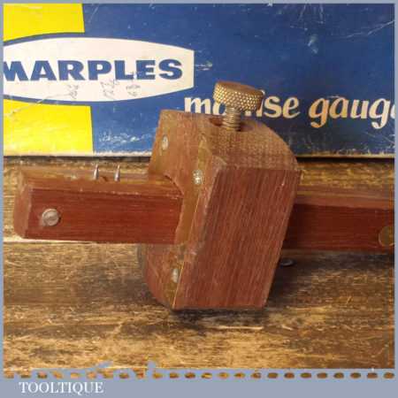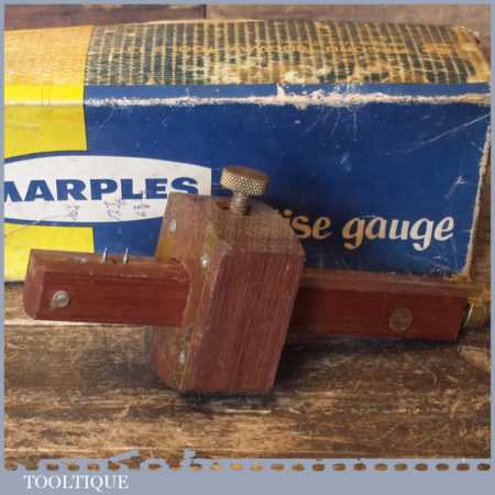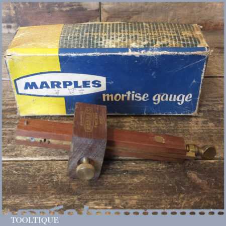 Vintage boxed W. Marples & Sons carpenter’s rosewood and brass mortise gauge with smooth action and good pins, in little used condition.