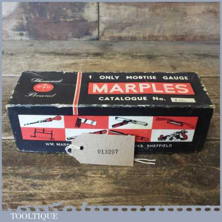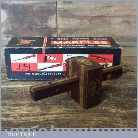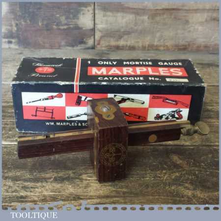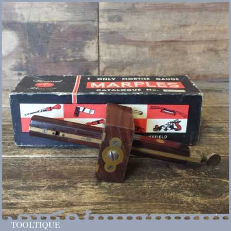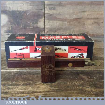 Vintage boxed W. Marples & Sons carpenter’s rosewood and brass mortise gauge with smooth action and good pins, in little used condition.