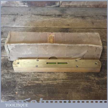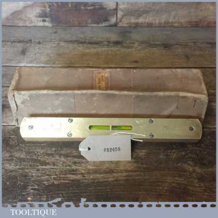 Vintage boxed W. Marples & Sons 12” beechwood and brass spirit level with original glass bubble tube, in good used condition. Note: the level hasn’t been tested and may require resetting in putty if intended for use.