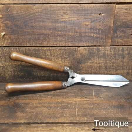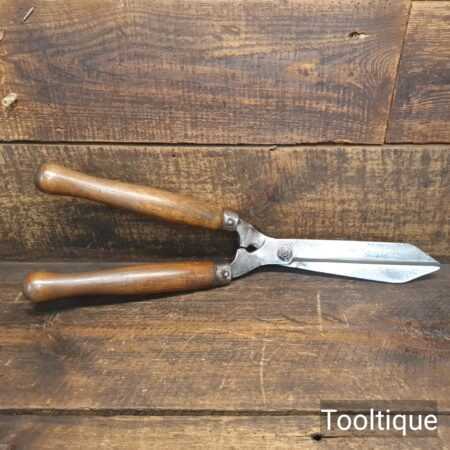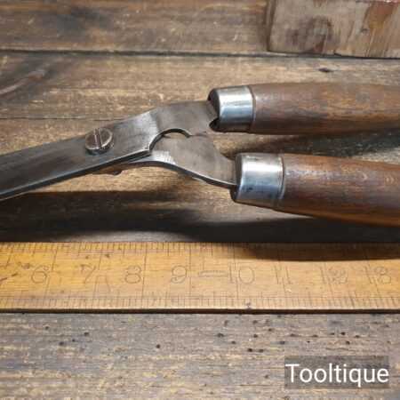 Vintage Brades Cast Steel gardeners trimming shears with beechwood handles measuring 19” in total length in good used condition, fully refurbished sharpened and honed ready for use. Note: these have been properly sharpened where they will slice rather than hack and will cut paper like scissors. The faces have also been dressed to eliminate wear.