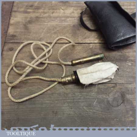 Vintage Brass 12 gauge bore gun barrel snake cleaner, weight with attached brush design in leatherette case.