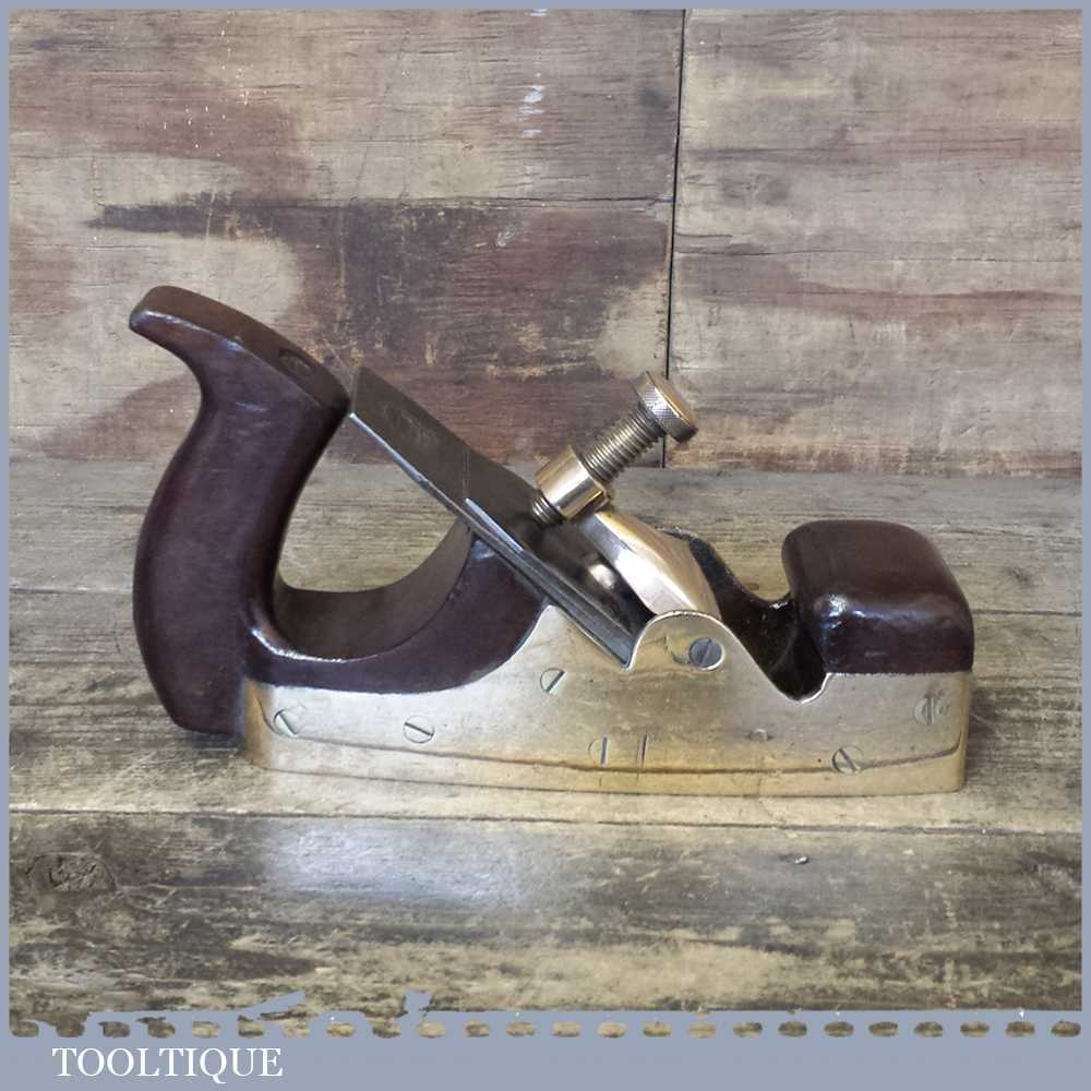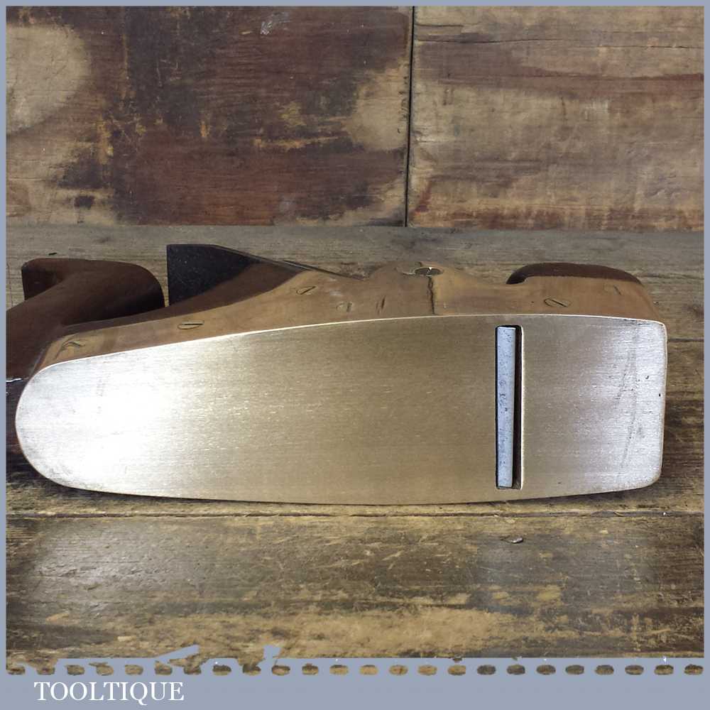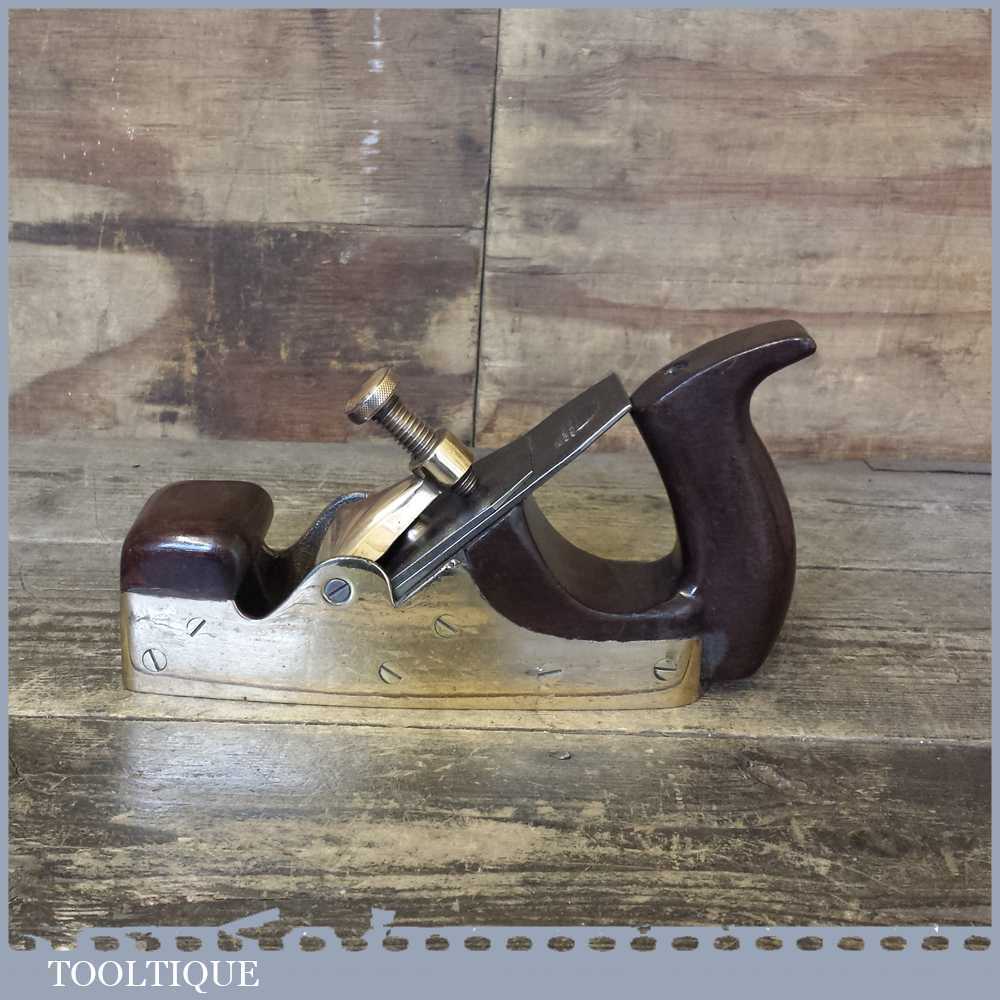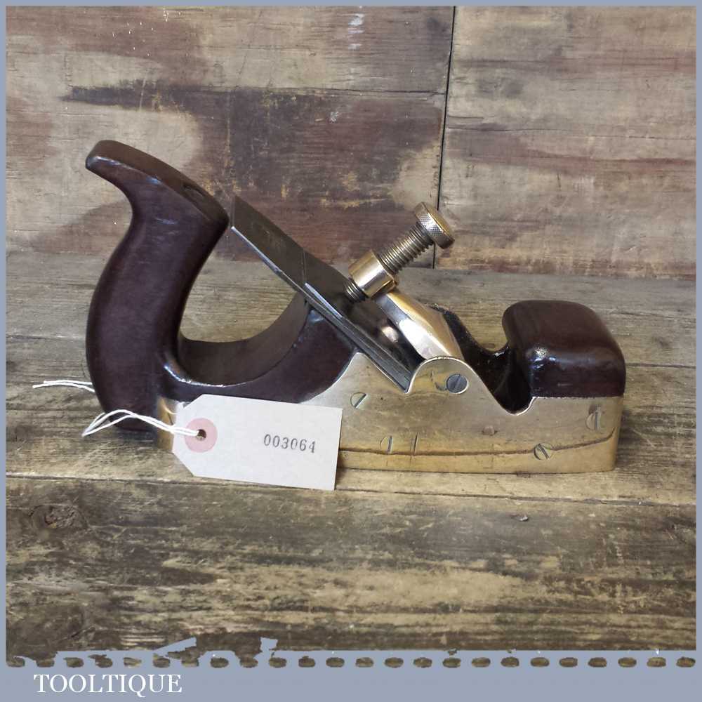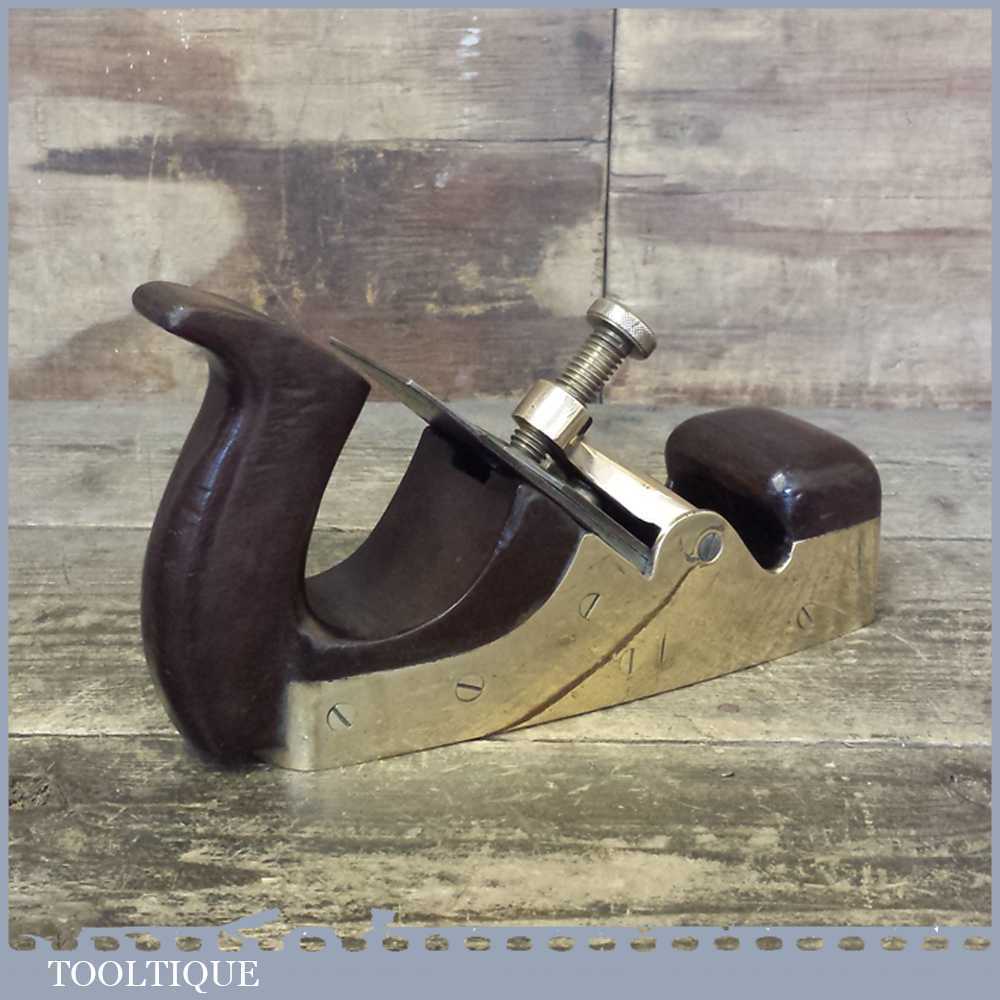Vintage Brass bodied smoothing plane with a mahogany infill that was in need of refurbishment when we got it and has been brought back to life, it has turned out well and has a good flat sole, sharp and works well. This plane will now age gracefully with handling now it is fit for purpose.