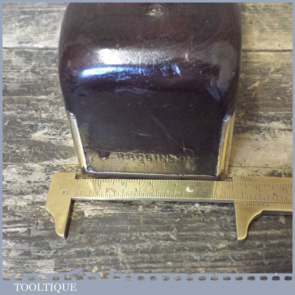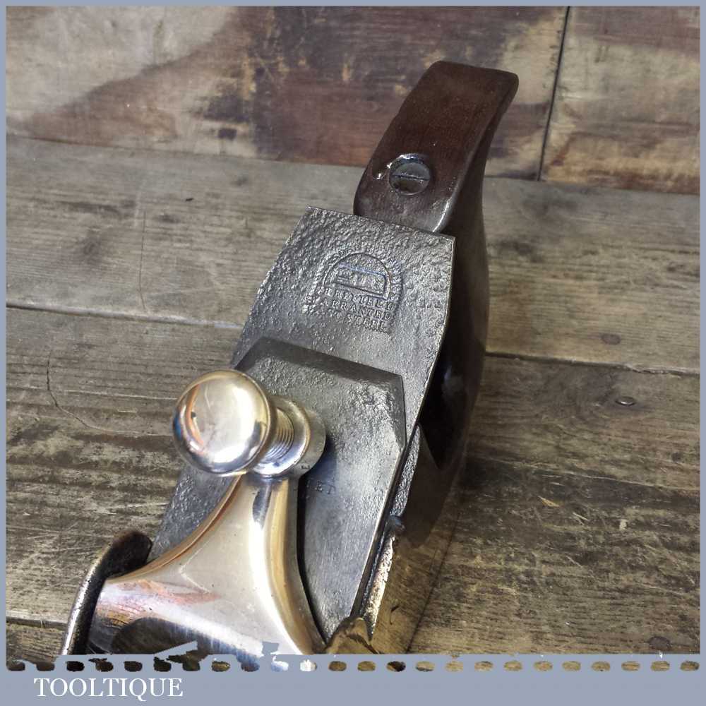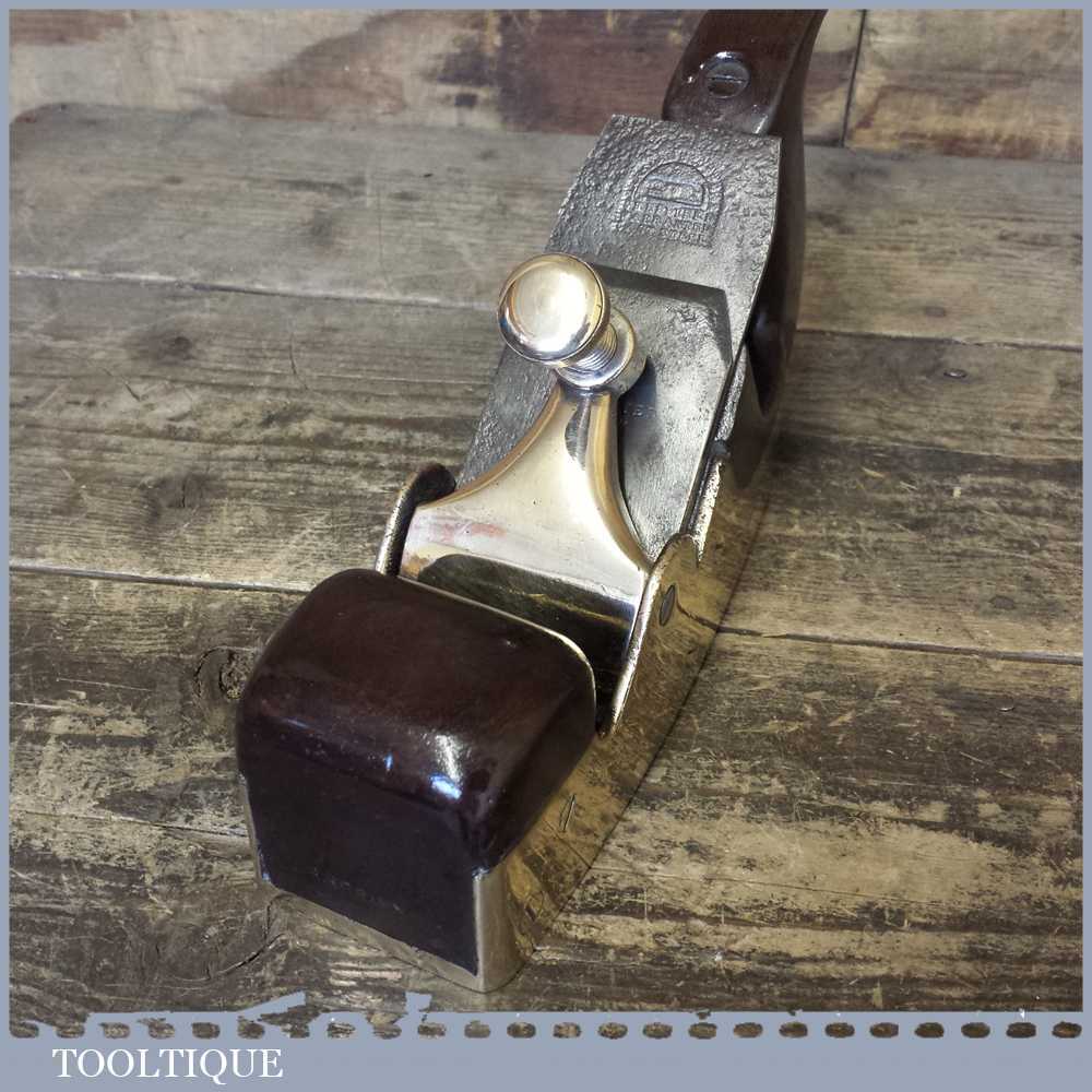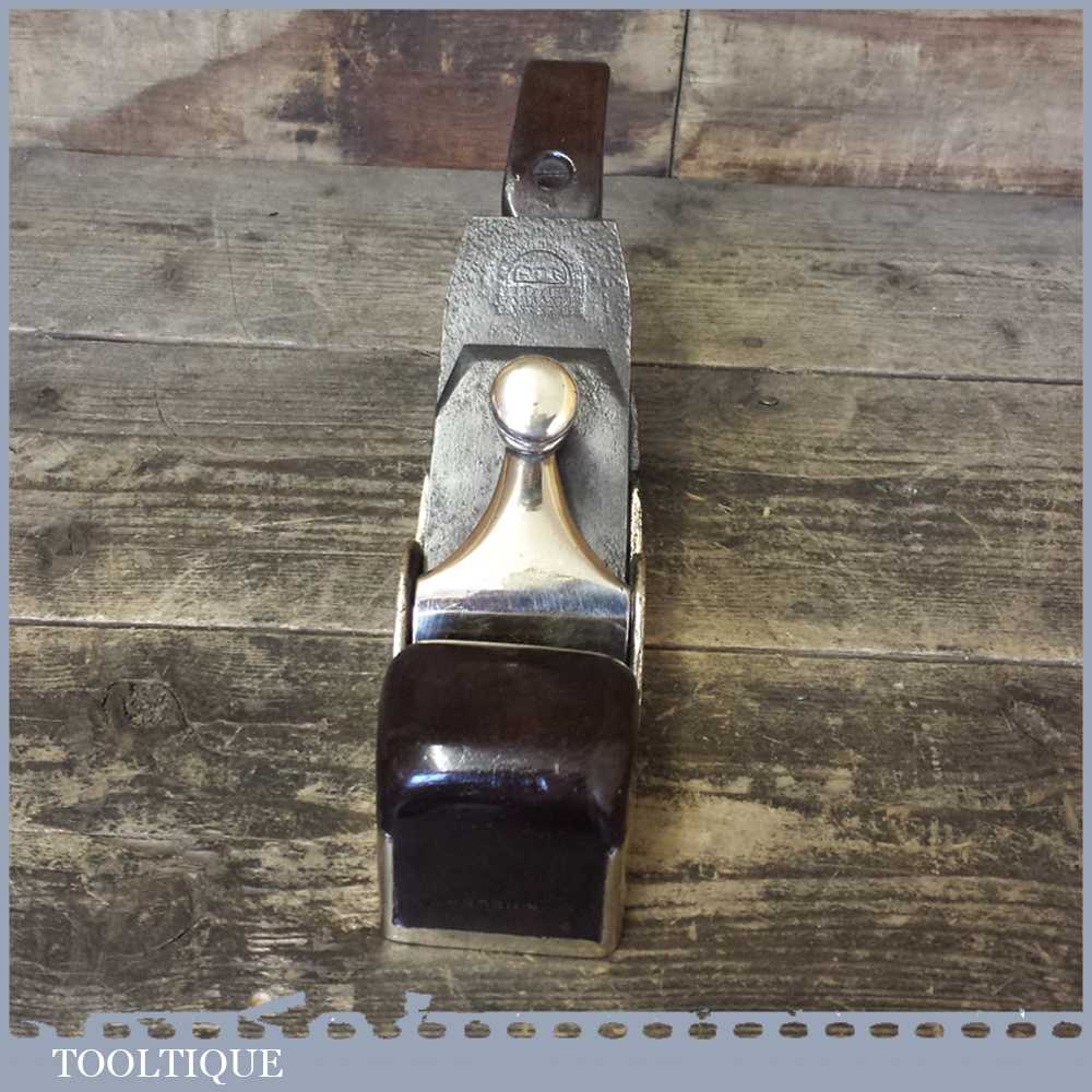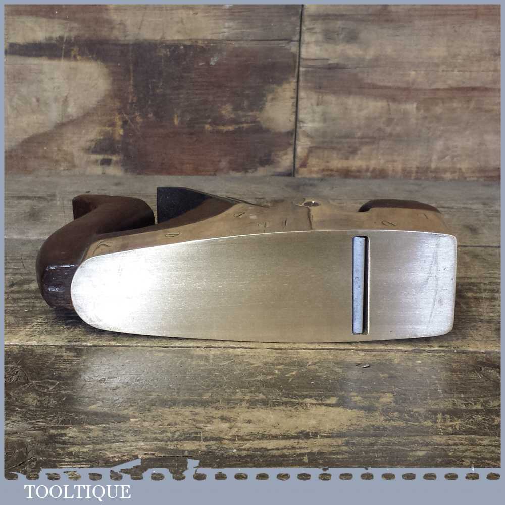 Vintage Brass bodied smoothing plane with a mahogany infill that was in need of refurbishment when we got it and has been brought back to life, it has turned out well and has a good flat sole, sharp and works well. This plane will now age gracefully with handling now it is fit for purpose.