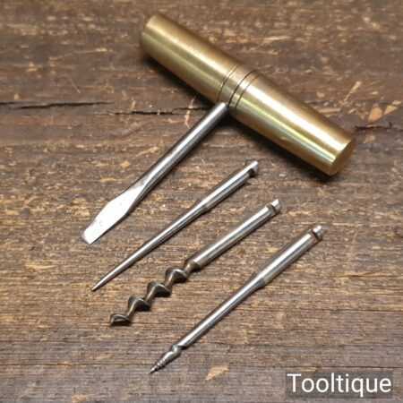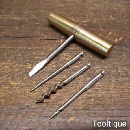 Vintage brass multi tool with 4 No. attachments encased in the screw top handle, in good used condition.