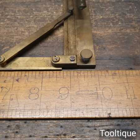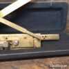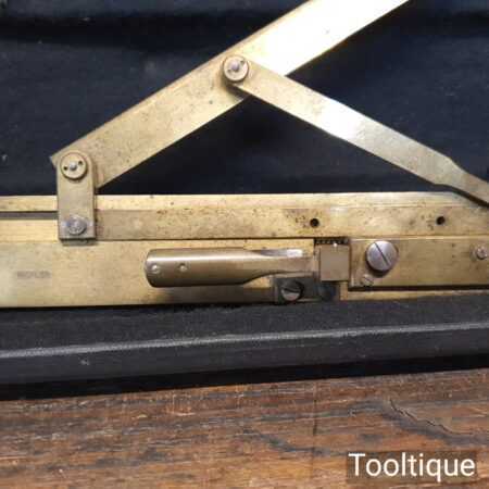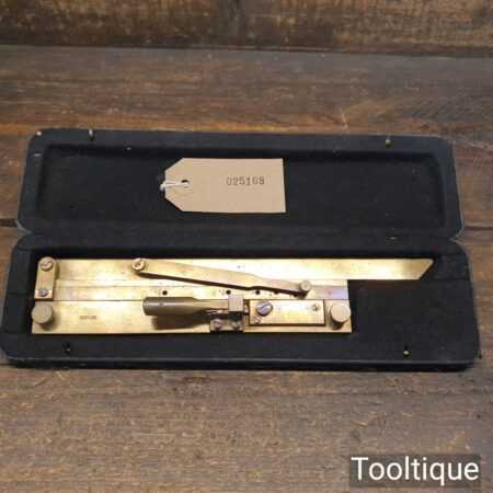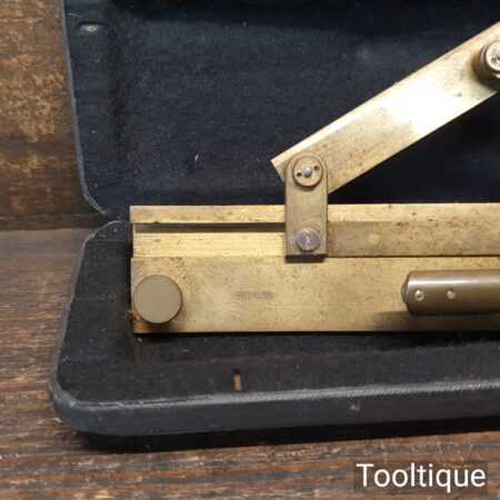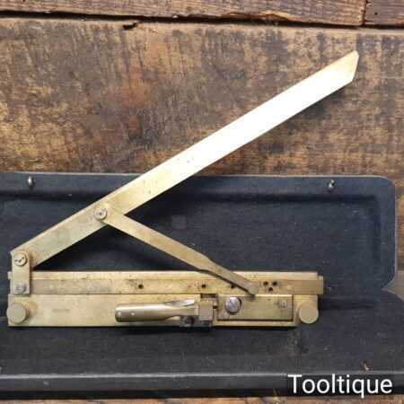 Vintage Brass Riefler Drafting Set Sectional liner c1900 in its original case and in good used condition. This rare device is used for drawing equally spaced inclined parallel lines, such as those found in machine drawings to represent section views, hence the name – Section Liner. The slope of the inclined ruler can be set to one of seven pre-set degree positions on the rack. The position can be advanced by activating the lever which moves on with the aid of a ratchet mechanism. This instrument is precision made from brass and is stored in a velvet lined, leather and cloth covered wooden case. Nice item.