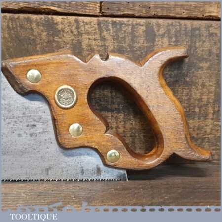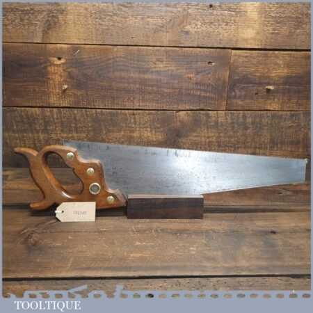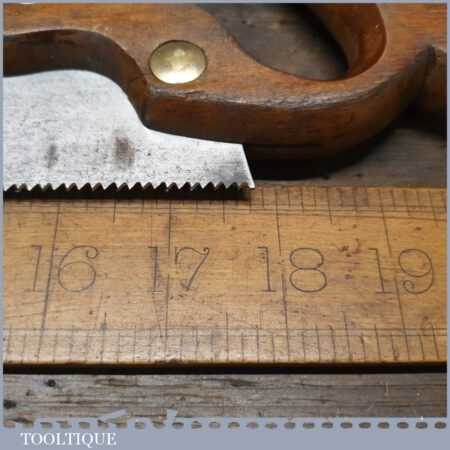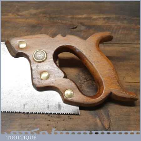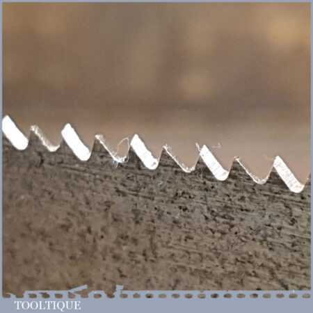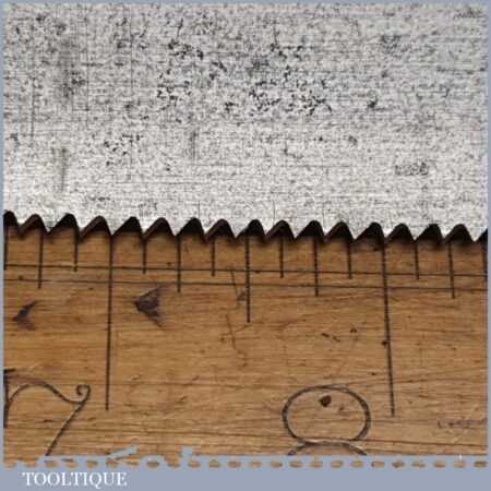 The saw has been thoroughly cleaned, jointed, resharpened and set by hand so that all the hard work of getting an old vintage saw right has been undertaken. We do this so that the next sharpening is easier and no more than a quick freshen up would be required. Those who are familiar with sharpening will know this is no small job and requires skill, effort and time to achieve good results.