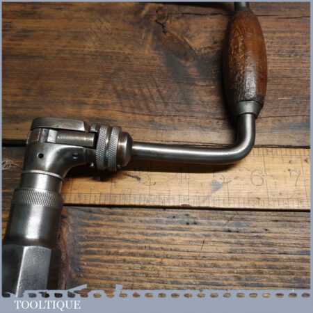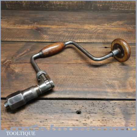 Vintage British made carpenter’s ratchet brace with beechwood handles and a 10” swing in good used condition, refurbished ready for use.