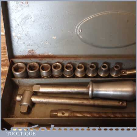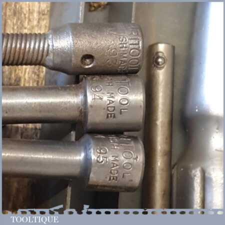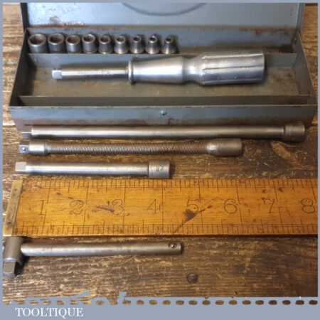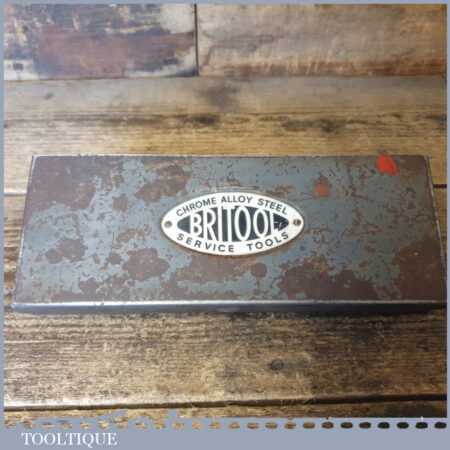 Vintage Britool 14-piece 1/4” square drive imperial socket set in original box and in good used condition.