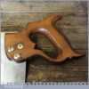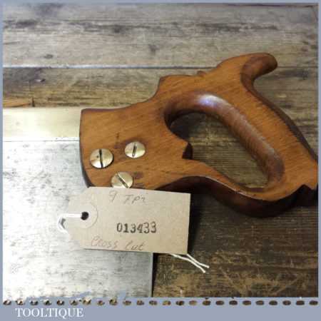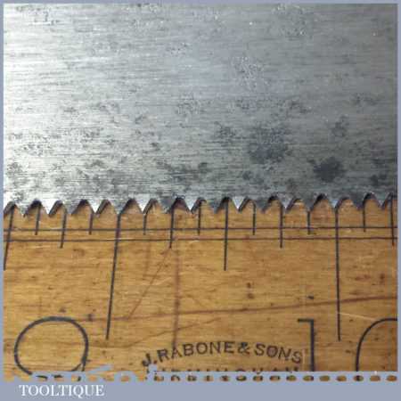 The saw has been thoroughly cleaned, jointed, resharpened and set by hand so that all the hard work of getting an old vintage saw right has been undertaken. We do this so that the next sharpening is easier and no more than a quick freshen up would be required. Those who are familiar with sharpening will know this is no small job and requires skill, effort and time to achieve good results.