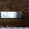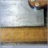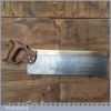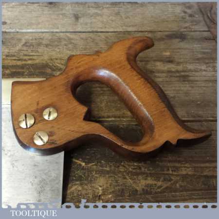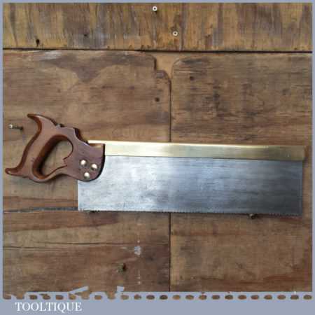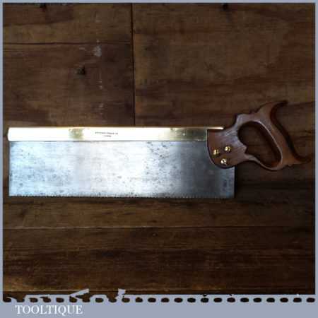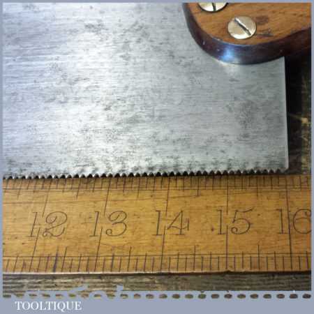 Vintage Buck & Hickman Ltd “Toga” brand 16” brass back tenon saw with 9 tpi, fully refurbished and sharpened cross cut ready for use. The saw has been thoroughly cleaned including under the handle, jointed, resharpened and set by hand so that all the hard work of getting an old vintage saw right has been undertaken. We do this so that the next sharpening is easier and no more than a quick freshen up would be required. Those who are familiar with sharpening will know this is no small job and requires skill, effort and time to achieve good results.