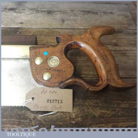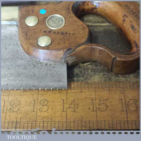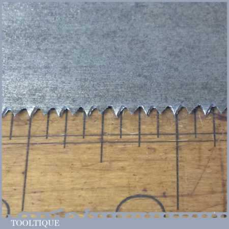 The saw has been thoroughly cleaned, jointed, resharpened and set by hand so that all the hard work of getting an old vintage saw right has been undertaken. We do this so that the next sharpening is easier and no more than a quick freshen up would be required. Those who are familiar with sharpening will know this is no small job and requires skill, effort and time to achieve good results.