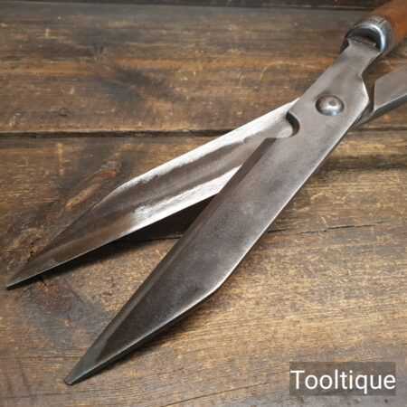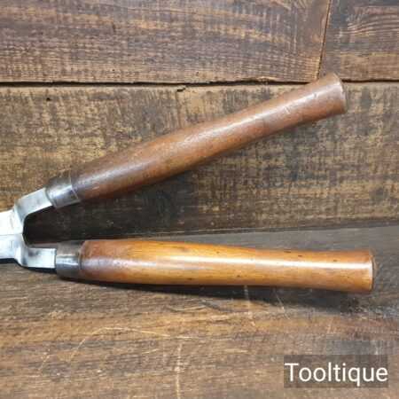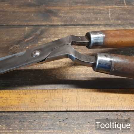 Vintage C. T. Skelton & Co. cast steel gardeners hedge trimming shears with beechwood handles measuring 22 ½” in total length in good used condition, fully refurbished sharpened and honed ready for use. Note: these have been properly sharpened where they will slice rather than hack and will cut paper like scissors. The faces have also been dressed to eliminate wear.