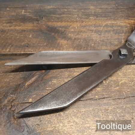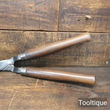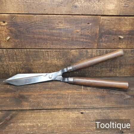 Vintage C. T. Skelton & Co. Cast steel gardeners hedge trimming shears with beechwood handles measuring 22 ½” in total length in good used condition, fully refurbished sharpened and honed ready for use. Note: these have been properly sharpened where they will slice rather than hack and will cut paper like scissors. The faces have also been dressed to eliminate wear.