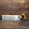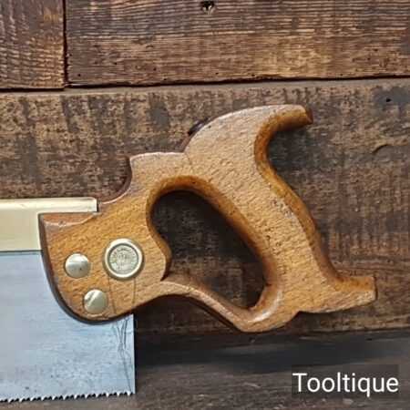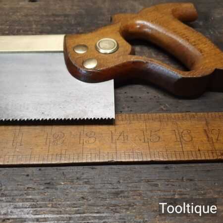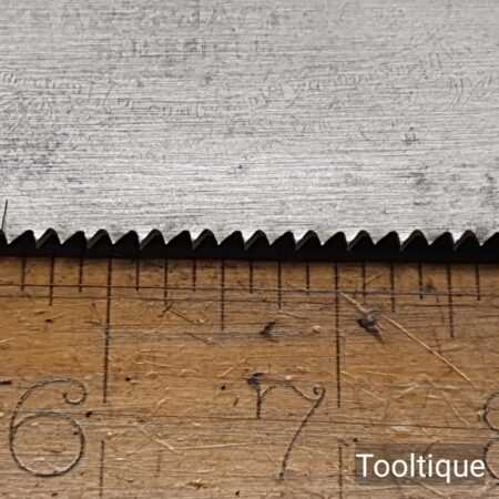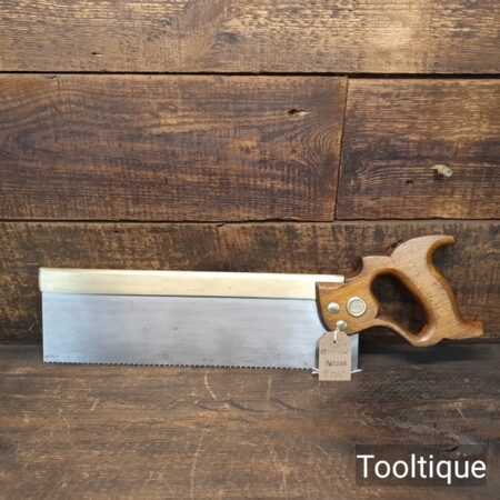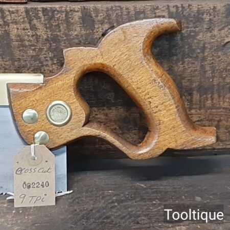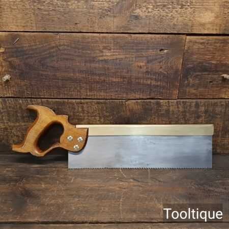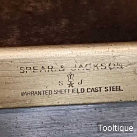 Vintage c1960 Spear & Jackson 14” Cross Cut Brass Back Handsaw with 9 Tpi, fully refurbished ready for use and in good used condition. Note: Sharpened using all three disciplines of Rake, Slope & Fleam for a sharper cleaner cut. The saw has been thoroughly cleaned, jointed, resharpened and set by hand so that all the hard work of getting an old vintage saw right has been undertaken. We do this so that the next sharpening is easier and no more than a quick freshen up would be required. Those who are familiar with sharpening will know this is no small job and requires skill, effort and time to achieve good results.