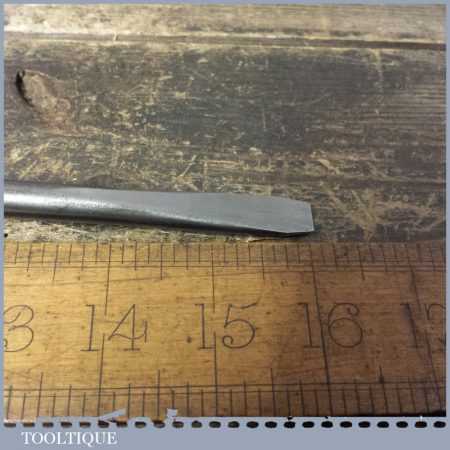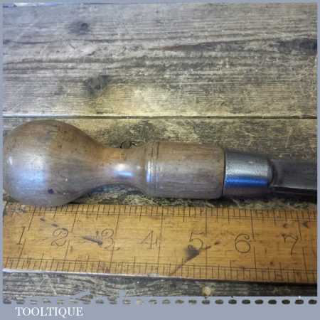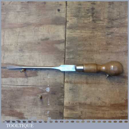 Vintage cabinet maker’s 16” turnscrew screwdriver with beechwood handle and approx a 3/8” tip in good used condition. This has been water cooled during the reshaping process to ensure it retained its original tempering and will work as it would have originally
