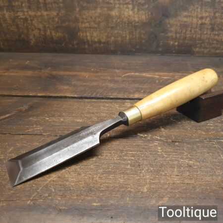 Vintage carpenter’s 1 ½” bevel edge chisel with boxwood handle in good used condition, fully refurbished sharpened and honed ready for use. Note: Old handling crack resin treated and is strong.