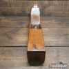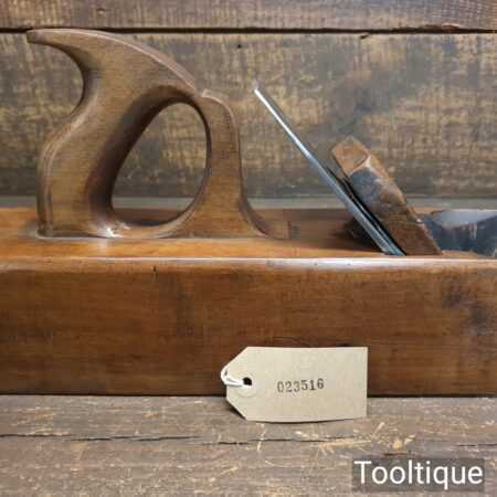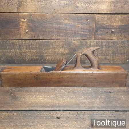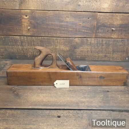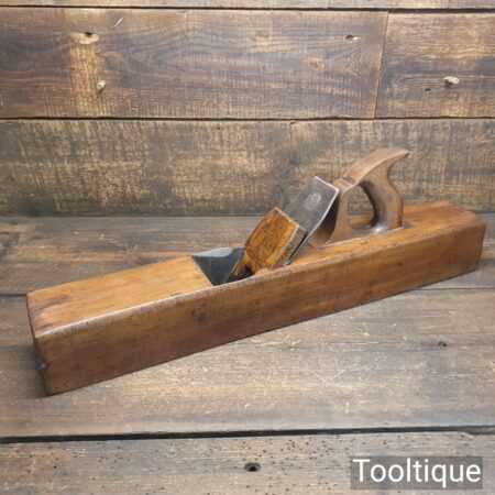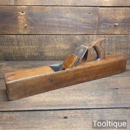 Vintage carpenter’s 22” beechwood trying plane in good used condition. Lapped flat, fettled and sharpened ready for use. Note: Throat closure insert added by previous owner.