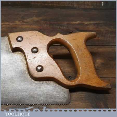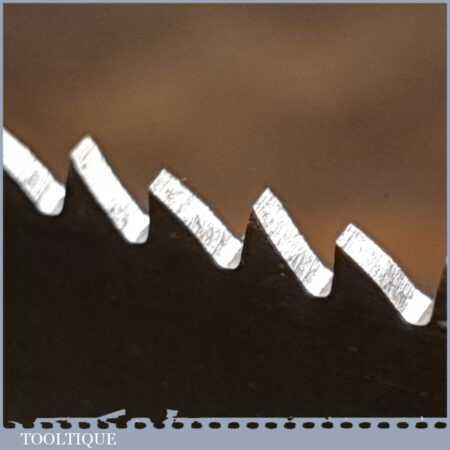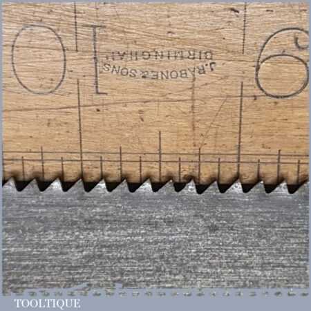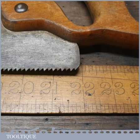 The saw has been thoroughly cleaned, jointed, resharpened and set by hand so that all the hard work of getting an old vintage saw right has been undertaken. We do this so that the next sharpening is easier and no more than a quick freshen up would be required. Those who are familiar with sharpening will know this is no small job and requires skill, effort and time to achieve good results.
