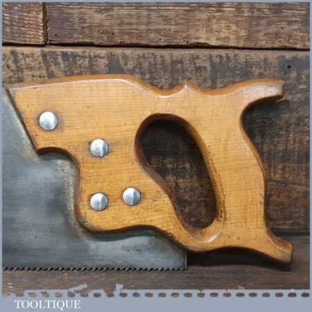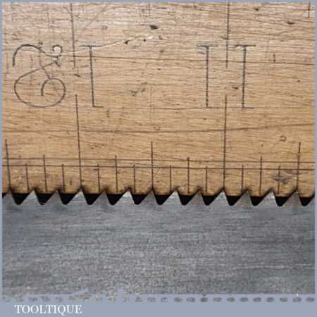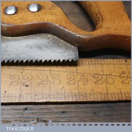 The saw has been thoroughly cleaned, jointed, resharpened and set by hand so that all the hard work of getting an old vintage saw right has been undertaken. We do this so that the next sharpening is easier and no more than a quick freshen up would be required. Those who are familiar with sharpening will know this is no small job and requires skill, effort and time to achieve good results.