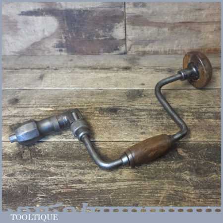 Vintage carpenter’s ratchet brace with beechwood handles and a 10” swing in good used condition, refurbished ready for use.
