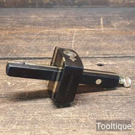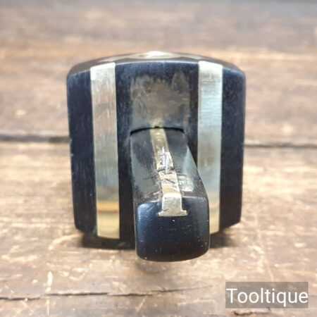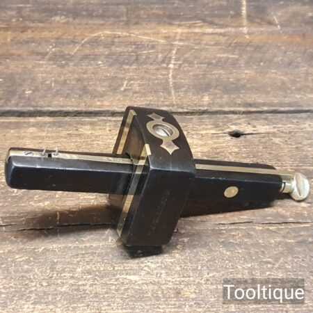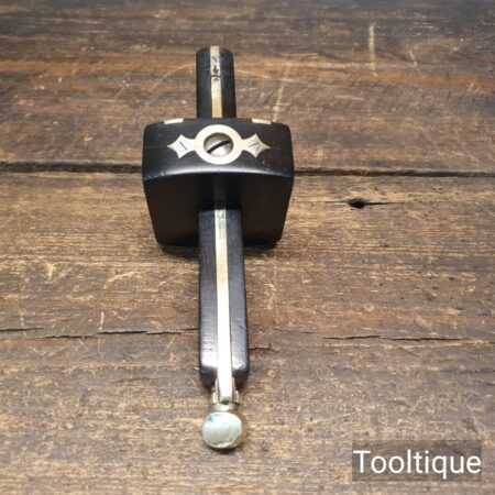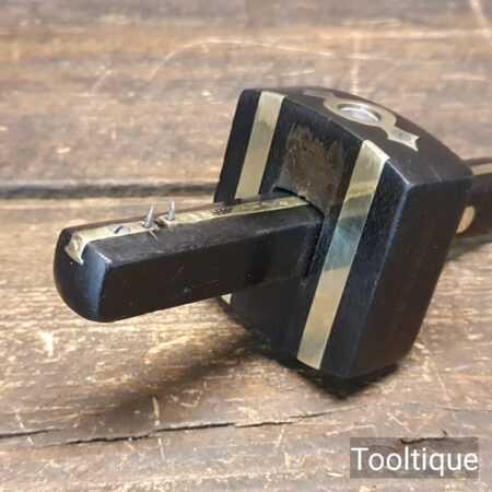 Vintage carpenter’s ebony and brass mortise gauge with smooth action and good pins, in good used condition. Note: Chip in the face has been filled but doesn’t affect its use, hence price. See images