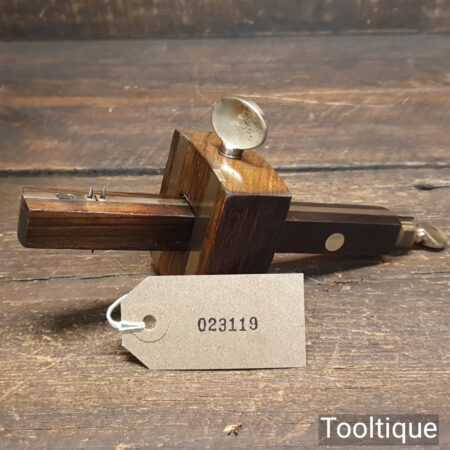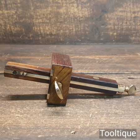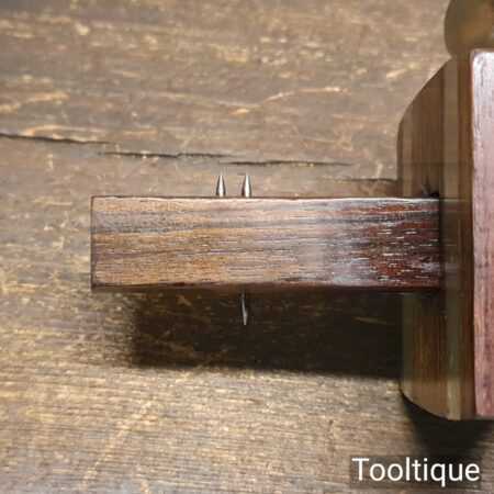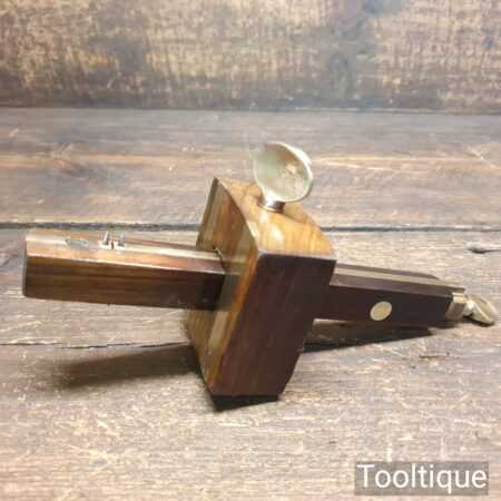 Vintage carpenter’s mahogany and brass mortise gauge with smooth action and good pins, in good used condition.