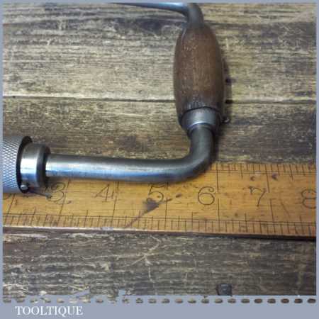 Vintage carpenter’s ratchet brace with beechwood handles and a 10” swing in good used condition, refurbished ready for use.