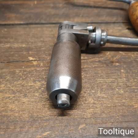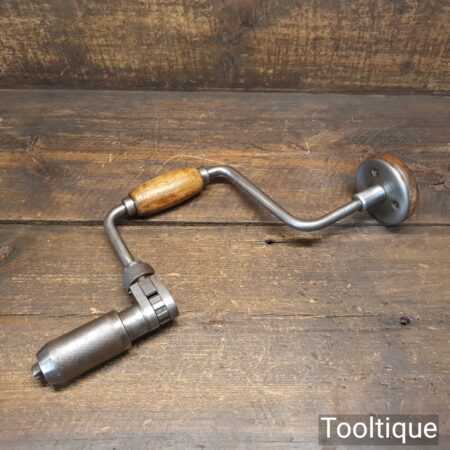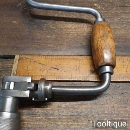 Vintage carpenter’s ratchet brace with beechwood handles and a 10” swing in good used condition, refurbished ready for use.