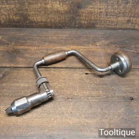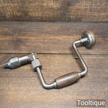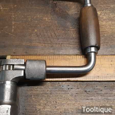 Vintage carpenter’s ratchet brace with beechwood handles and a 10” swing in good usable condition.