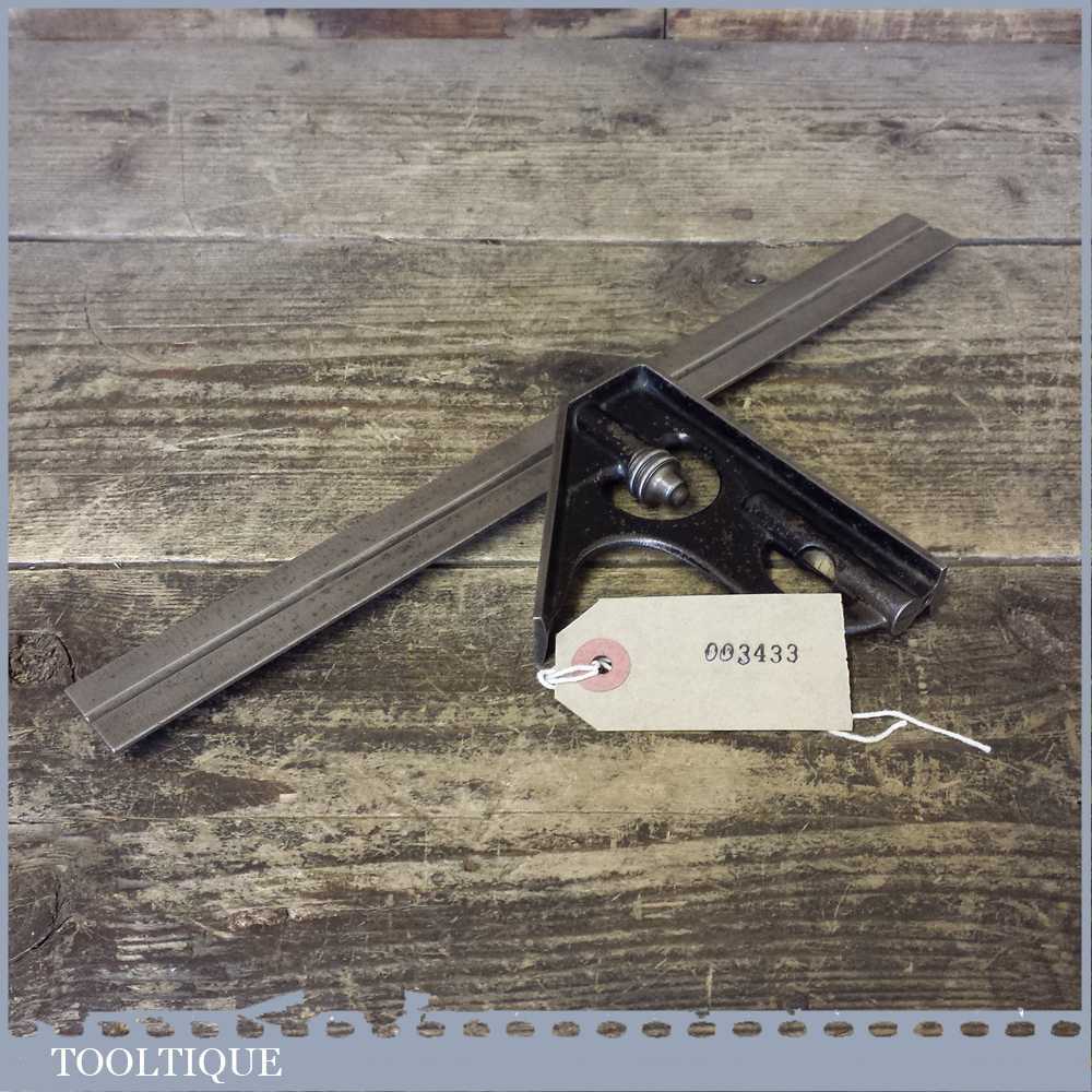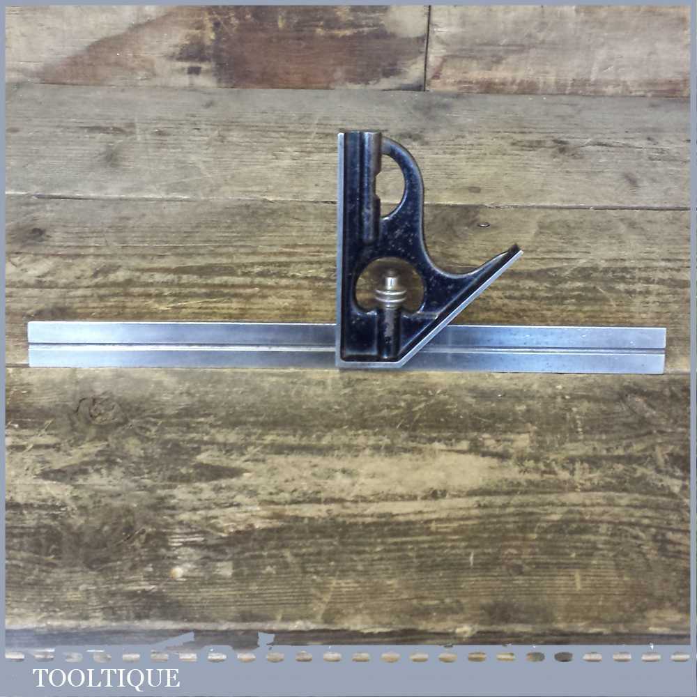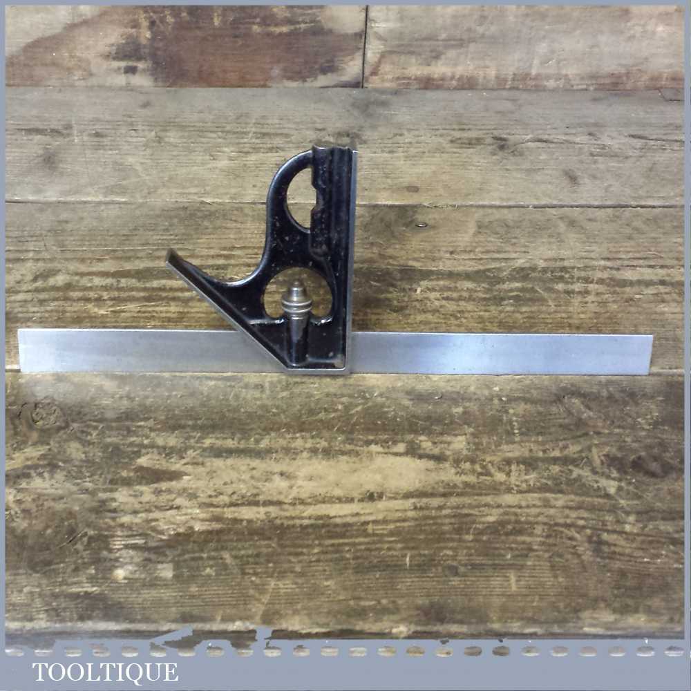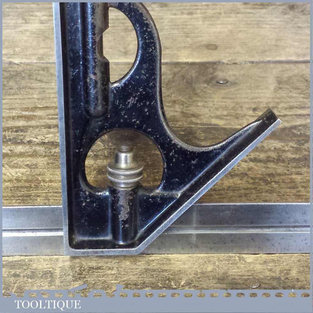Vintage cast steel adjustable combination square in good used condition. Note: unable to decipher maker as marking on the ruler have worn. Bubble is intact.