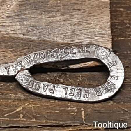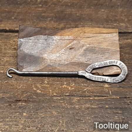 Vintage cast steel button hook tool with advertising for ‘The Wood Milne Shoe Shines’ & ‘Rubber heel Pads’.