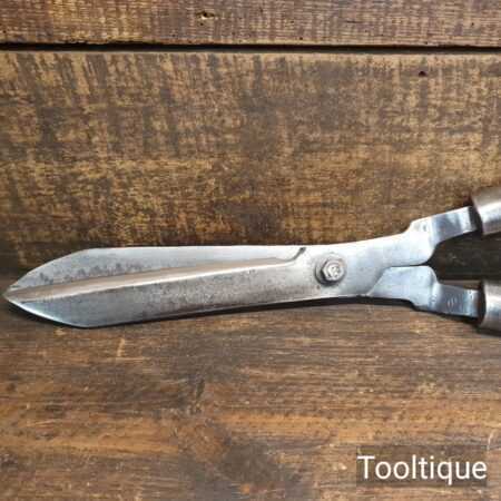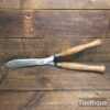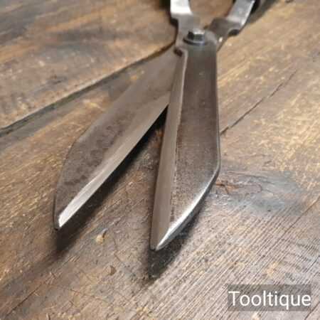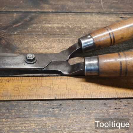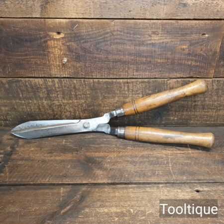 Vintage Cast steel gardening hedge trimming shears with beechwood handles measuring 22” in total length in good used condition, fully refurbished sharpened and honed ready for use. Note: These have been properly sharpened where they will slice rather than hack and will cut paper like scissors. The faces have also been dressed to eliminate wear.