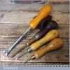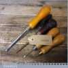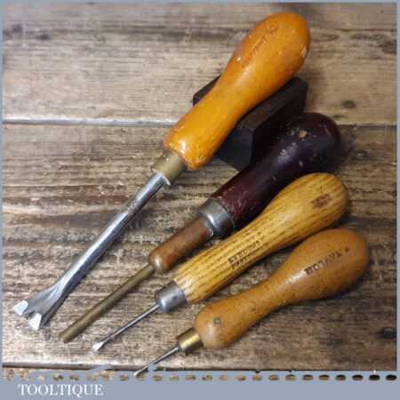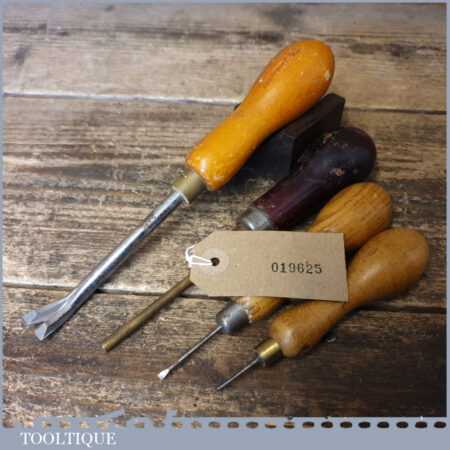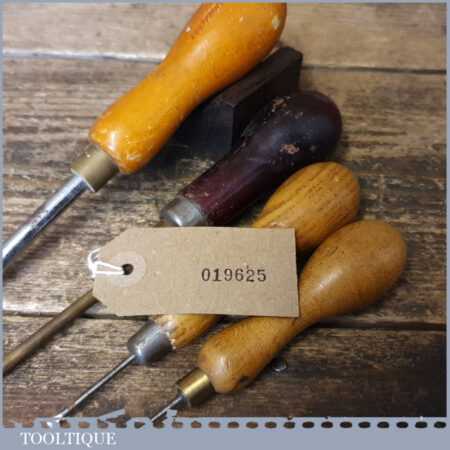 Vintage collection of 2 No: bradawls, 1 No: pin push and 1 No: tack lifter, in good used condition.