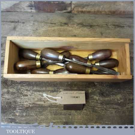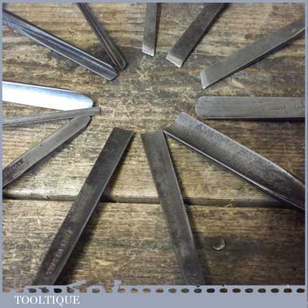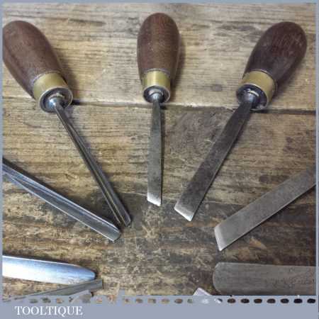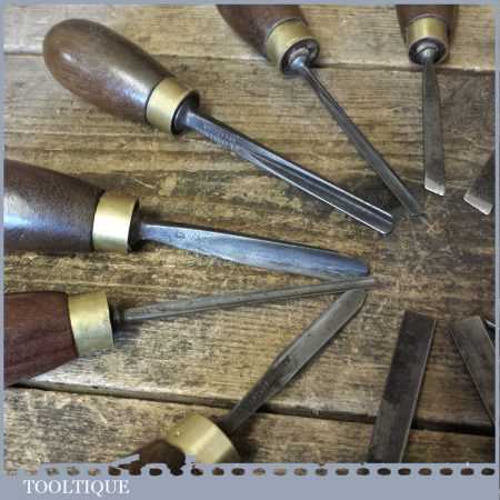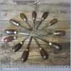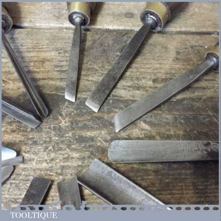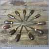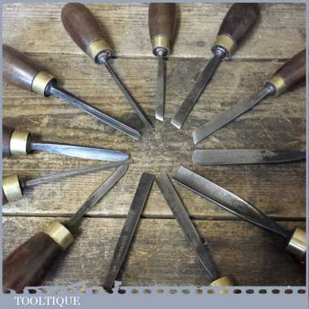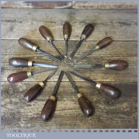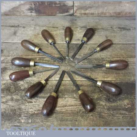 Vintage collection of 12 No: wood carving palm chisels by various makers in good used condition. Note: all fitted with hardwood handles.