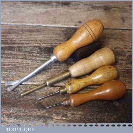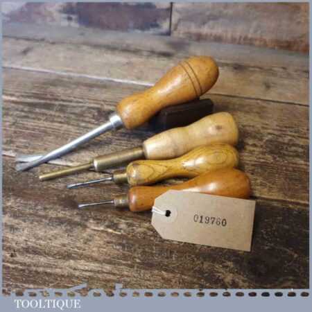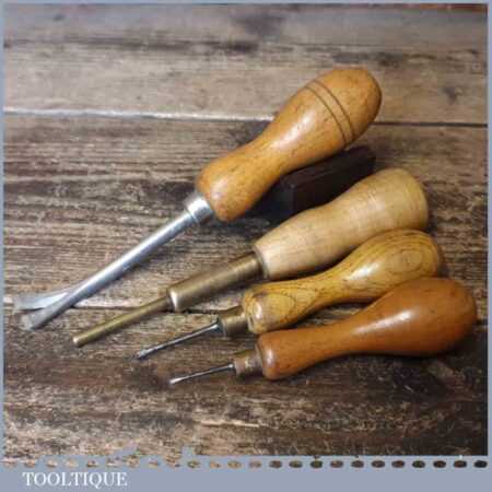 Vintage collection of tools including 2 No: bradawls, 1 No: pin push and 1 No: tack lifter, in good used condition.