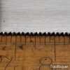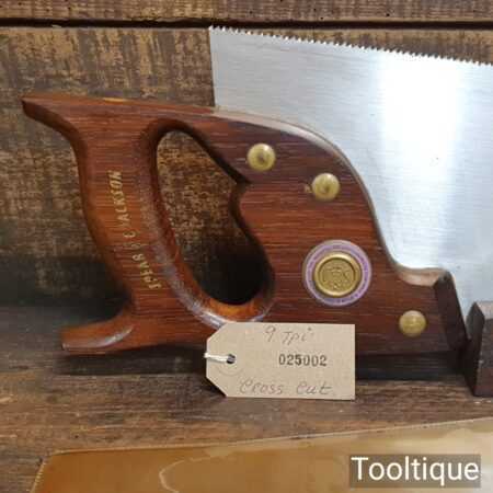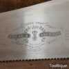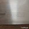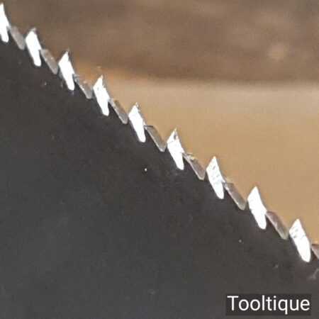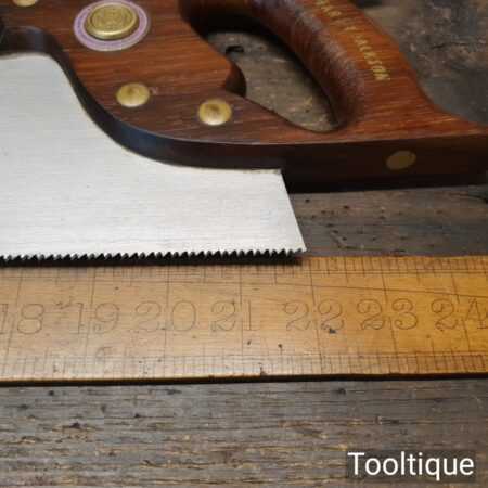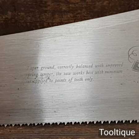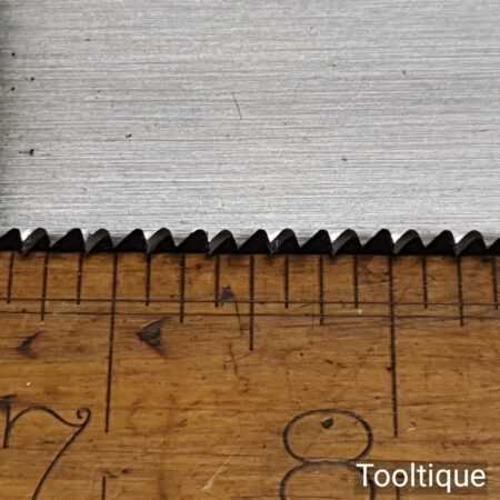 The saw has been thoroughly cleaned, jointed, resharpened and set by hand so that all the hard work of getting an old vintage saw right has been undertaken. We do this so that the next sharpening is easier and no more than a quick freshen up would be required. Those who are familiar with sharpening will know this is no small job and requires skill, effort and time to achieve good results.