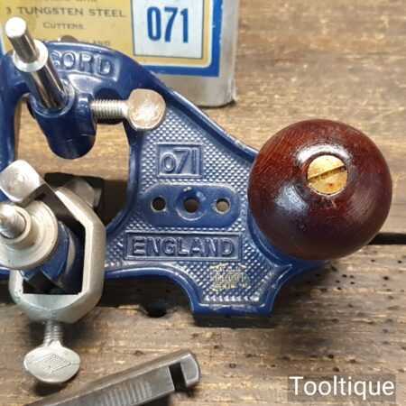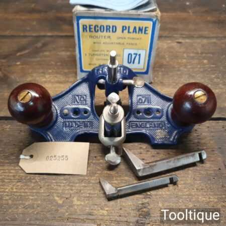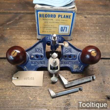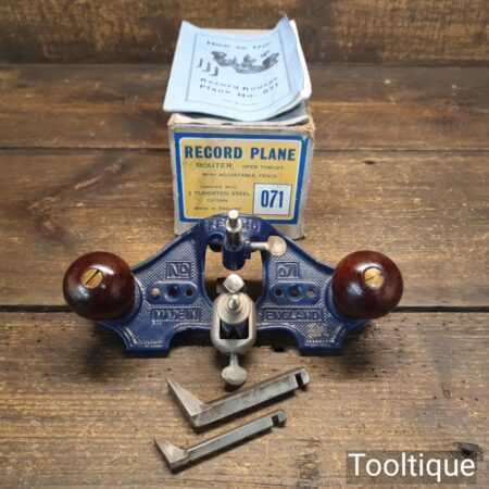Vintage Crisp Boxed Record No: 071 hand router plane complete with fence, depth stop and 3 irons and in good used condition. Note: Handles refinished.